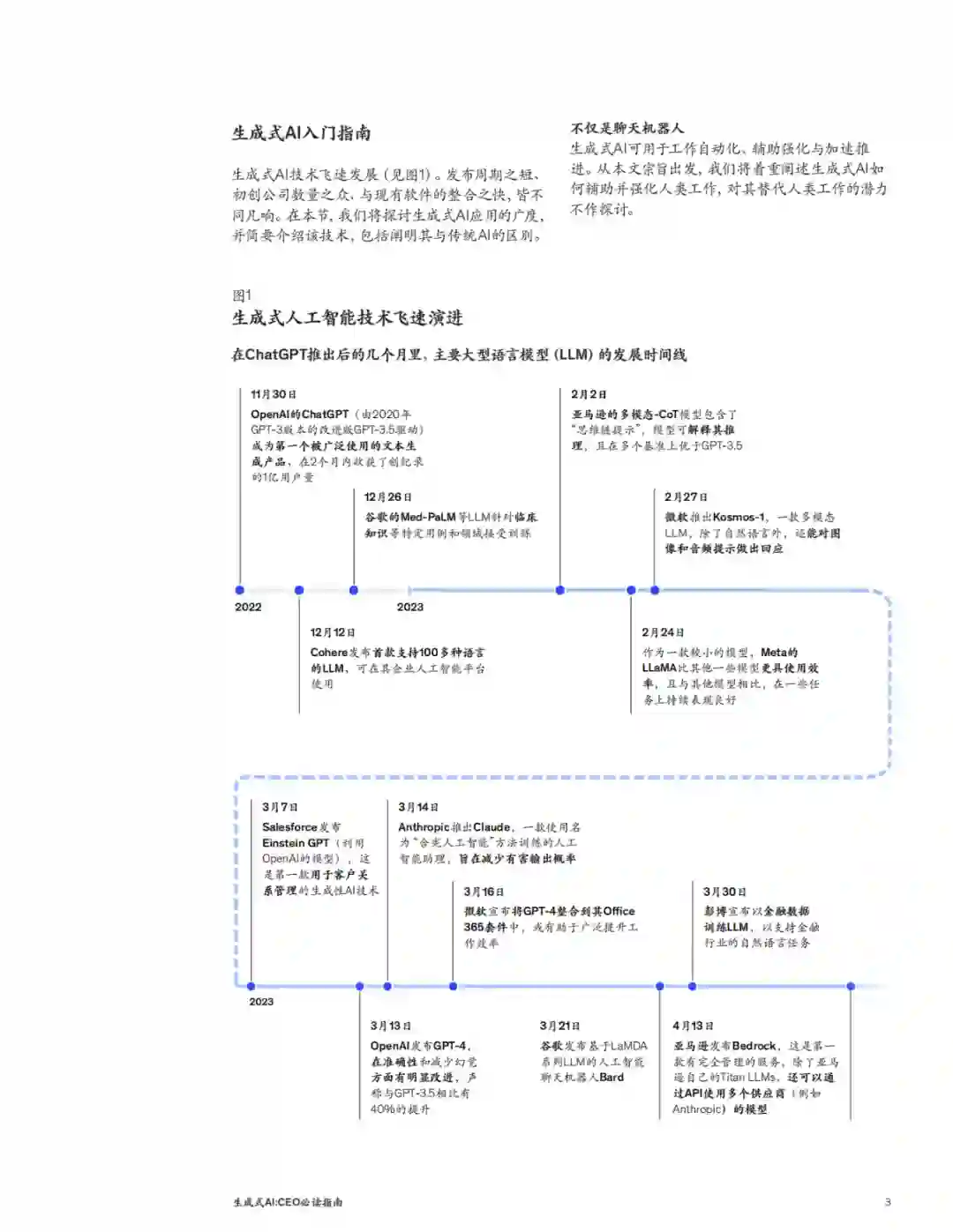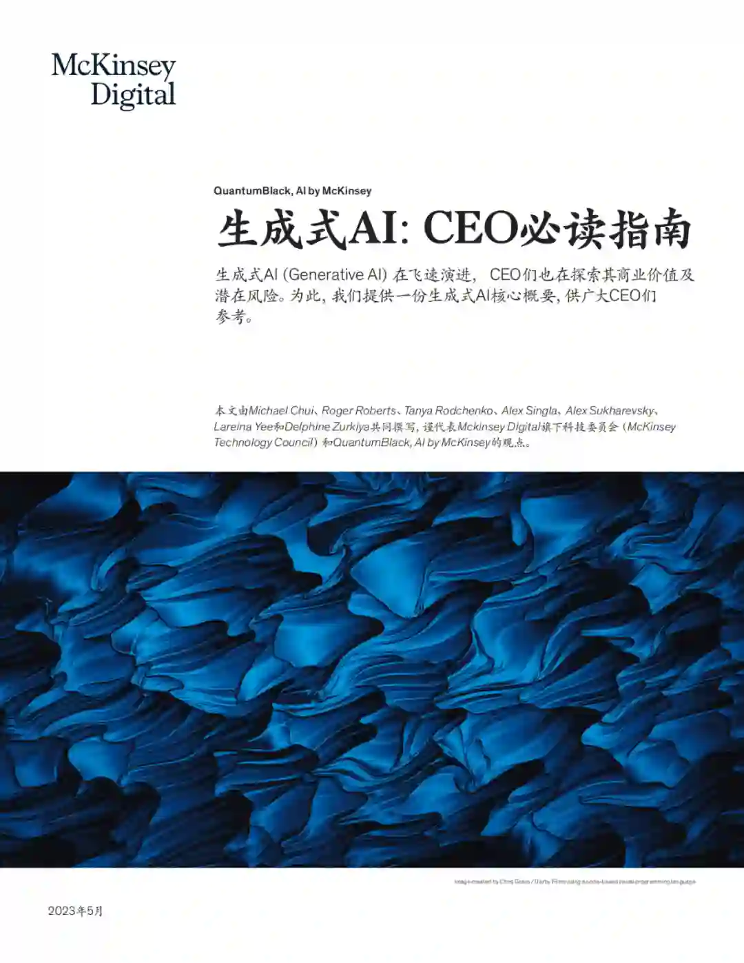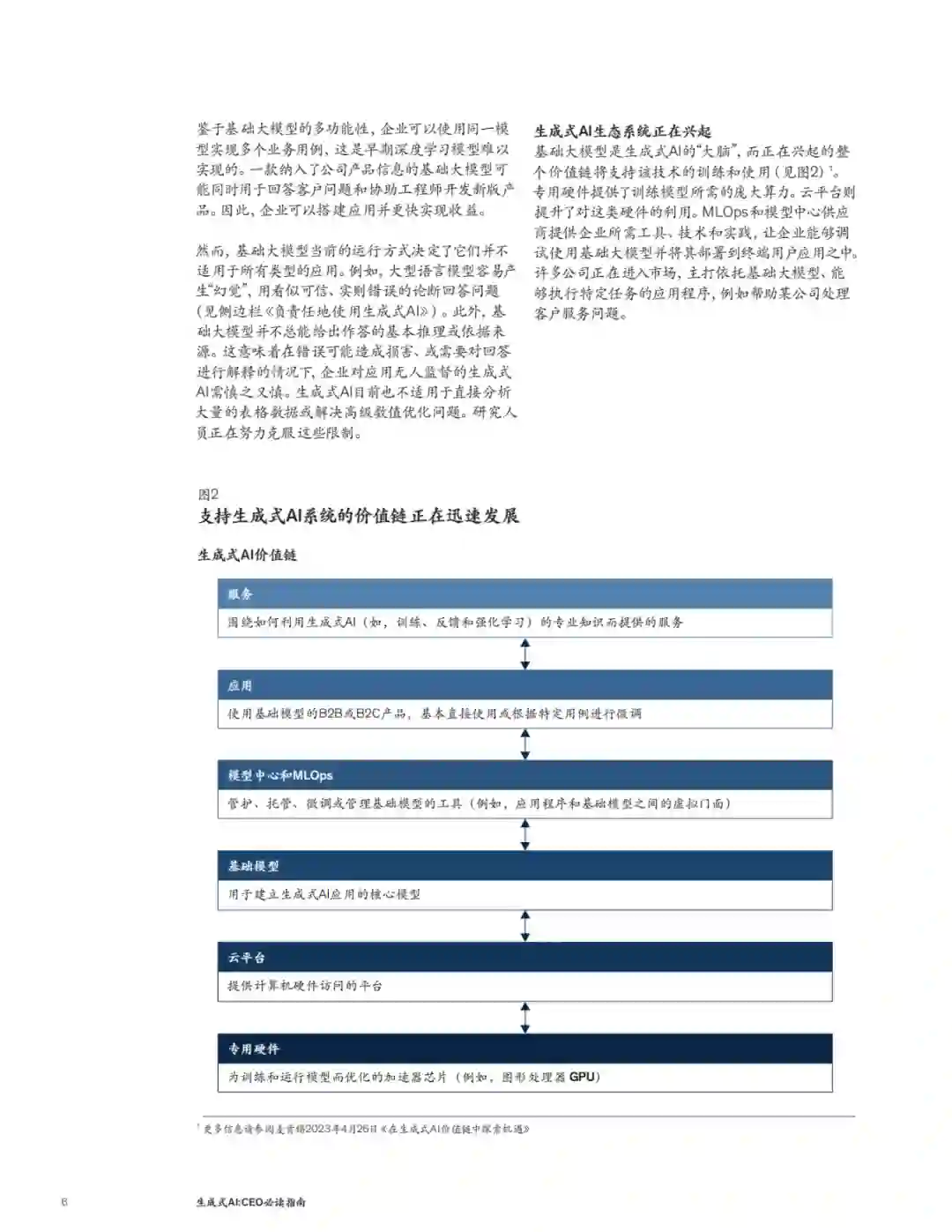 自ChatGPT、Bard、Claude、Midjourney以及其他内 容生成工具问世以来,人们对生成式AI抱有很高期 待。各企业CEO自然也在思考:这究竟是科技炒作, 还是颠覆行业格局的机遇?如果是后者,那生成式 AI能给自身业务带来什么价值? ChatGPT的大众版仅两个月就吸引到1亿用户。它以 史无前例的方式推动了AI的普及,已成为迄今增长 最快的应用程序。无与伦比的易用性让生成式AI有 别于以往所有AI技术。用户不需要专修机器学习就 可以开展交互、获取价值——只要会提问,几乎人 人都能用。就像个人电脑或iPhone等其他突破性技 术一样,一款生成式AI平台可以衍生出许多应用程 序,适用于各个年龄段和教育水平的用户群体,人 们无论身处何地,能够上网即可使用。 而实现这一切,依靠的是驱动生成式AI聊天机器人 的基础大模型,它们是经由大量非结构化、无标签 数据(如文本、音频等各类形式)训练的庞大神经 网络。基础大模型可处理各种各样的任务。相比之 下,以往的AI模型通常适用范围更“窄”,往往只能执 行一项任务,如预测客户流失率等。而一个基础大 模型则既能为一份2万字的量子计算技术报告生成 内容摘要,又能为园艺公司起草市场进入策略,还 能根据冰箱里的10种食材给出5张不同的食谱。不 过,在其丰富功能的背后,目前还存在结果不够准 确的短板,这也让人们再度关注起AI的风险管理 问题。 在监管得当的情况下,生成式AI不仅可以为企业开 辟新用例,还可以加速、扩展或改进现有用例。以 电销场景为例,经过专门训练的AI模型可以帮助销 售人员发现追加销售机会,但截至目前,这些模型 通常还只能根据通话前收集的人口统计信息和购买 规律等静态客户数据来判断追加销售的可能性。生 成式AI工具则可根据实际对话内容,利用内部客户 数据、外部市场趋势和社交媒体影响者数据,实时 为销售人员提供追加销售建议。同时,生成式AI还 可以为销售人员撰写销售话稿,供其根据具体情况 进行调整。 上述例子只展示了AI技术对人类工作潜在影响的一 个侧面,而实际上,几乎所有知识工作者都有可能 因使用生成式AI而获益。尽管生成式AI最终可能会 让部分工作自动化,但其价值将更多来自于被嵌入 日常工具(如电子邮件或文字处理软件)后知识工 作者对它的使用。这类升级后的工具可以大幅提高 生产力。 CEO们想知道是否应立即采取行动,以及如果采 取行动,该从何开始。有些人可能从中看到了机遇, 希望通过重塑人与生成式AI应用程序协同工作的 方式,在竞争中弯道超车。其他人则可能希望谨慎 行事,在进行大规模投资之前先尝试几个用例,增 进对生成式AI的理解。企业也需要评估自身是否具 备必要的技术专识、技术及数据架构、运营模式以 及风险管理流程,这些是更进一步部署生成式AI 时所需要的。 本文旨在帮助CEO及其团队思考生成式AI的价值创 造场景以及如何开始应用。首先,我们总结了生成 式AI的入门指南,以帮助CEO更好了解AI日新月异的 发展现状和可行技术选择。第二部分将通过4个旨 在提高组织效能的案例,探讨企业如何应用生成式 AI。这些案例来自我们对早期采用者的观察,并介 绍了在技术、成本和运营模式要求等方面的各种选 择。最后,我们将探讨CEO如何发挥关键作用,利 用生成式AI带领企业走向成功。 人们对生成式AI的期待显而易见,企业高管自然希 望借此东风运筹帷幄,有计划地快速推进。我们希 望本文能让商业领袖更全面了解生成式AI未来潜力。