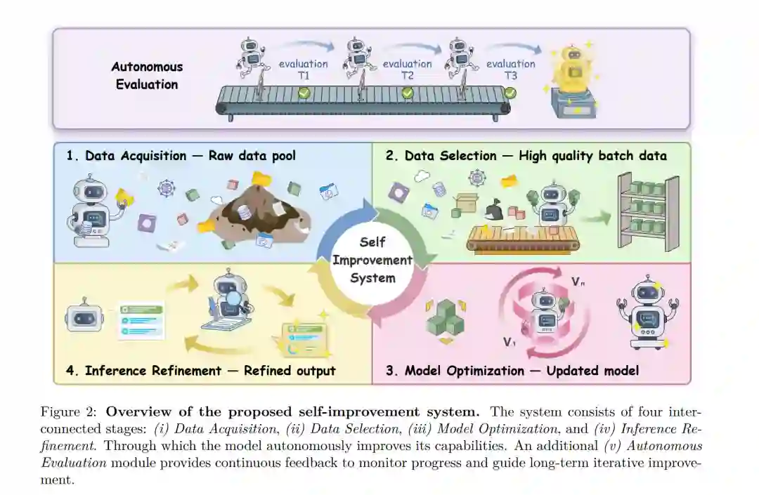 受上述愿景启发,如图 2 所示,我们提出了一个由五个互连组件组成的生命周期自我提升系统。其中四个组件——数据获取(Data Acquisition)、数据筛选(Data Selection)、模型优化(Model Optimization)和推理细化(Inference Refinement)——共同回答了一个核心问题:为了构建端到端的自我提升系统,如何在不同阶段利用模型自身来驱动持续且自主的贡献?具体而言: * 数据获取:模型自主收集或生成其训练数据。 * 数据筛选:模型独立评估并过滤出质量更高、更适合自身学习的数据点。 * 模型优化:模型自主学习,有效地将数据转化为其参数内部的增强能力。 * 推理细化:模型在推理过程中提升自身表现,而无需更改其底层参数。