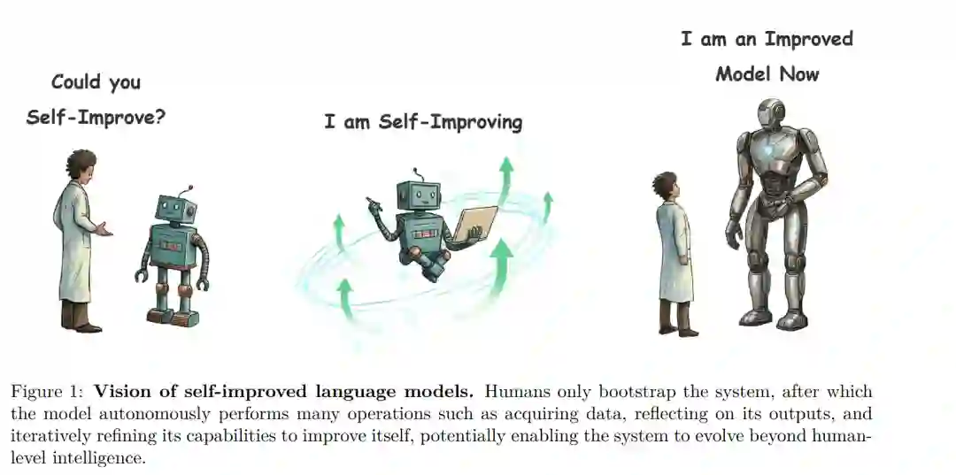 从自动化的视角来看,这一方向不仅是理想的,更是自然的。随着 LLM 变得日益先进,它们已展示出解决复杂工程任务和进行高层决策的能力。鉴于 LLM 的开发流程(包括数据获取、筛选及模型训练)本身就是一项高度复杂的工程,将这些职责委托给模型自身是发展的必然趋势。通过将 LLM 作为智能体来编排自身的开发生命周期,一个“系统侧”的自我提升闭环得以建立。如图 1 所示,我们的愿景是从人类驱动的模型开发转向自主自我提升系统范式,使 LLM 能够通过自我导向的迭代和反馈不断增强其能力。 我们将 LLM 的自我提升定义为一种学习范式,即模型在无需持续的人类在环(Human-in-the-loop)监督下,迭代地增强自身能力。该范式具有两个核心属性:自主性(Autonomy),即改进过程在没有持续人工标注或手动纠正的情况下运行。“自我”并不排斥外部组件的使用,例如教师模型、验证器、批判器、奖励模型或自动评估器仍可被引入,关键要求是学习闭环在部署后必须是完全自动化的;持续性(Continuity),自我提升并非一次性的优化,而是一个迭代的、自我强化的过程,早期阶段的输出或经验被重新利用,为随后的更新生成更强的监督信号。每一轮改进都依赖并放大先前的结果,从而实现随时间的累积性进展。在此定义下,自我提升不仅是提高任务指标的技术,更是一种实现持续、自主增长的结构性能力。从 AI 长期发展的视角看,这种能力被广泛认为是构建能够超越初始训练机制、持续学习与适应系统的核心。