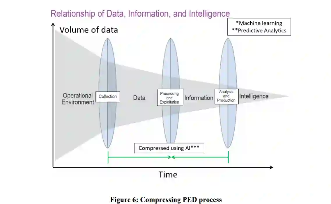 指挥、控制、通信、计算机、情报、监视和侦察(C4ISR)以及机器人和自主系统(RAS)技术的普及正在改变战争的特点,使较小的部队能够分布和影响更大的区域。然而,作战期间收集的数据正在迅速超越人类的认知能力。早在 2013 年,美国国防部就指出:"ISR 收集和......收集的数据急剧增加。我们继续发现,我们收集的数据往往超出了我们的处理、利用和传播能力。我们还认识到,就战术层面的分析人员数量而言,PED 的资源需求可能永远都不够"。