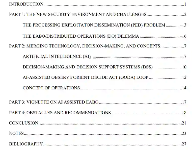 本文旨在证明,利用人工智能技术可加快指挥官在其环境中的观察、定位、决策和行动能力。本文承认,但并不打算解决射频通信、信息系统和组织变革中出现的技术问题的重大障碍。本文分为四个不同的部分。第一部分重点讨论不断变化的安全环境和新兴技术带来的挑战,以及这些挑战将如何影响指挥官。第二部分讨论技术解决方案、决策模型,以及人工智能作为 DSS 如何为 EAB 指挥官创造认知、时间和致命优势。第三部分将在未来冲突中,在 EAB 指挥官很可能面临的假想作战场景中说明这种系统的优势。最后一部分重点讨论了实施过程中遇到的障碍,并对今后的工作提出了建议。