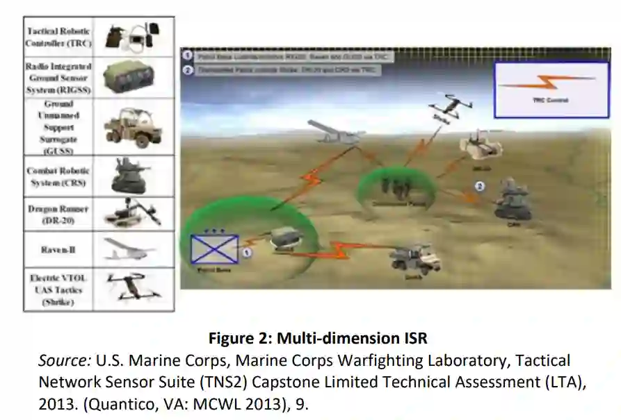 鉴于 Baron 的结论,C4ISR/RAS 将降低而不是提高战术指挥官的决策能力。笔者在担任海军陆战队作战实验室(MCWL)科技处地面战斗部(GCE)处长期间进行的研究证实了这一结论。2013 年,海军陆战队作战实验室 (MCWL) 开展了战术网络传感器套件 (TNS2) 有限技术评估 (LTA)。一个海军陆战队步枪连及其下属排配备了空中和地面机器人、地面传感器以及战术机器人控制器(TRC)。战术机器人控制器使一名操作员能够在白天或黑夜,在视线范围外同时控制多辆战车进行 ISR。MCWL 将这种 ISR 形式命名为多维 ISR(图 2)。LTA显示,使用TNS2的排级指挥官在防御、进攻和巡逻时都能迅速发现威胁,但LTA也发现了两个重大问题:1.在软件和机器人能够自主分析和关联传感器输入之前,海军陆战队员仍需收集和整理ISR数据;2.在中高作战压力下... 在中度到高度的作战压力下......操作人员会超负荷工作......无法探测和识别目标,并普遍丧失态势感知能力。