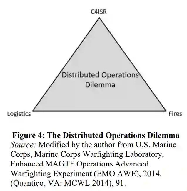 然而,DO 和 EABO 是零和博弈。C4ISR 和 RAS 技术可以让部队分布得更远,但实验表明,规模经济会丧失。增加兵力将增加所有领域的需求。正如皮涅罗在 2017 年的一篇研究论文中总结的那样:"当部队分散时,就会失去指挥与控制、情报和火力等辅助功能的效率。"在后勤方面也是如此。这种 "DO 困境 "可以用以下经过修订的 "三重约束范式 "来表示(图 4)。随着部队的分散,一个领域的整合将削弱另一个领域的能力。如果 EAB 指挥官能在不增加 EAB 占地面积的情况下提高能力,就能重新获得规模经济效益。智能技术整合可以解决这一问题。