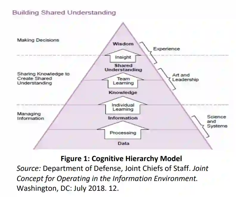 如果情报驱动军事行动,那么海军陆战队就会出现问题。如前所述,数据收集的速度超过了战术层面的处理、利用和传播(PED)过程。数据本身是无用的,必须经过组织和背景化处理才有价值。根据认知层次模型(图 1),数据和信息对形成共同理解至关重要。联合情报流程通过规划和指导、收集、处理和利用、分析和制作、传播和整合以及评估和反馈这六个阶段来实现这一目标。C4ISR/RAS 的扩散扩大了收集范围,但 PED 却没有相应增加。除非采取措施实现信息管理自动化,否则指挥官将面临信息超载和决策瘫痪的风险。