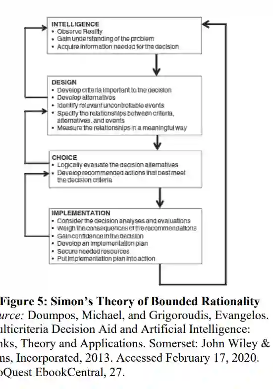 决策支持系统可以是一个人用来提高决策质量的任何方法。海军陆战队营长利用其参谋人员和联合规划流程 (JPP) 提供专家判断来提高决策质量,而商业部门也越来越依赖于决策支持系统和人工智能来处理大量数据。在本文中,决策支持系统被定义为 "帮助用户进行判断和选择活动的基于计算机的交互式系统",也被称为基于知识的系统,因为 "它们试图将领域知识形式化,使其适合于机械化推理"。大多数 DSS 都采用西蒙的有限理性理论(Theory of Bounded Rationality)来建模,该理论承认人类在信息、时间和决策认知方面的局限性。西蒙提出了一个四步模型(图 5),包括:1.观察现实的智能;2.制定和衡量标准和备选方案的设计;3.评估备选方案和建议行动的选择;以及 4.根据信息采取行动的实施。4. 执行,根据信息采取行动,最后反馈到第一步。
