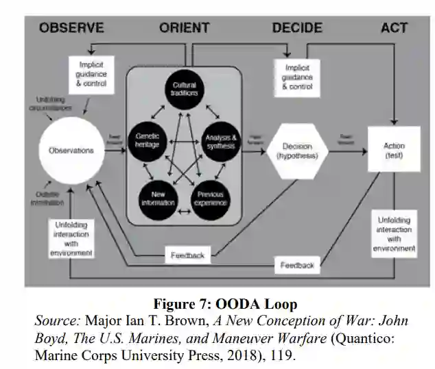 在步骤 4.“ 行动”中,指挥官正在执行任务,并利用反馈机制为其下一个决策周期提供信息,该决策周期已通过综合通信、火力和指挥控制网络进行了沟通,以确定可用和适当的武器系统。人工智能 OODA 循环将循环往复地进行下去,直到指挥官达到预期的最终状态或情况不再需要采取战术行动。通过利用人工智能作为 DSS,指挥官实现了以下目标: