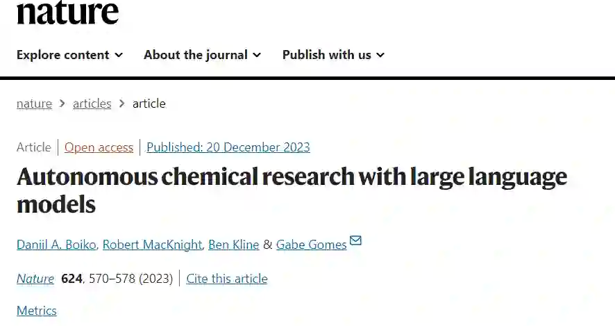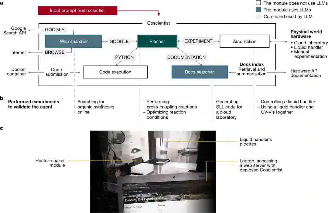 论文题目:Autonomous chemical research with large language models期刊来源:Nature论文地址:https://www.nature.com/articles/s41586-023-06792-0斑图地址:https://pattern.swarma.org/paper/a6117a4e-9f8b-11ee-bc79-0242ac17000e 基于transformer的大语言模型在自然语言处理、生物学、化学和计算机编程等多个领域都取得了长足进步。这项研究中展示的 Coscientist 是一个由 GPT-4 驱动的人工智能系统,它能自主设计、规划和执行复杂的实验,并将大语言模型与互联网和文档搜索、代码执行和实验自动化等工具相结合。这项工作已经独立完成,并与其他智能主体的工作并行,ChemCrow是化学领域的另一个例子。 研究中展示了 Coscientist 在以下六项任务中的多功能性和性能:(1)使用公开数据规划已知化合物的化学合成;(2)高效搜索和浏览大量硬件文档;(3)使用文档在云实验室中执行高级指令;(4)使用低级指令精确控制液体处理仪器;(5)处理需要同时使用多个硬件模块和整合不同数据源的复杂科学任务;以及(6)解决需要分析先前收集的实验数据的优化问题。