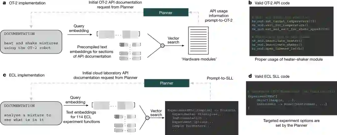 图1:Coscientist的系统架构。将大语言模型与互联网和文档搜索、代码执行和实验自动化等工具相结合。 图2:文档查询结果展示