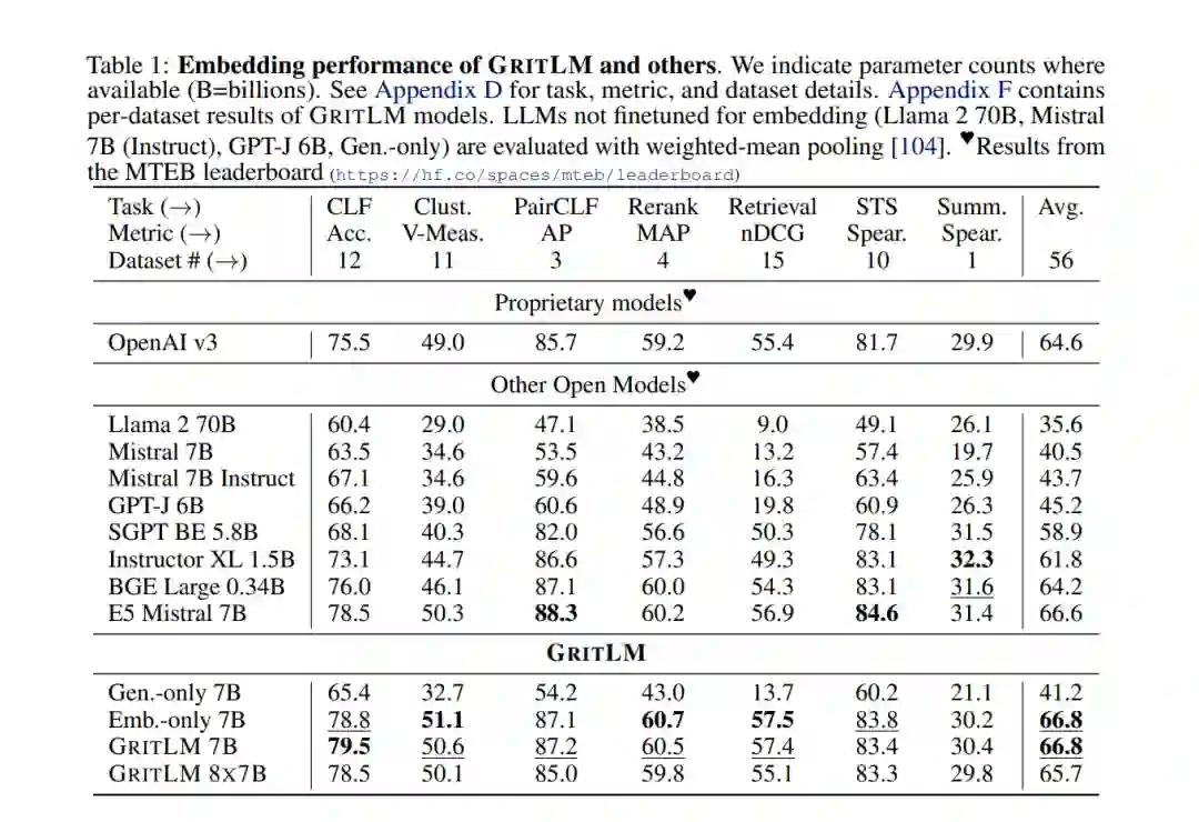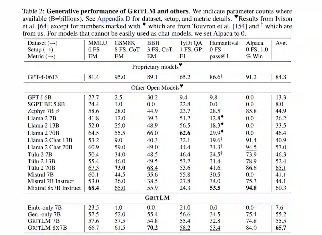 值得注意的是,我们的公式支持不同数量的嵌入样本(M)和生成样本/令牌(N)。这允许显著增加嵌入批量大小,同时保持生成批量大小固定。大的嵌入批量大小通常是文本嵌入模型表现良好的关键[169]。然而,这需要在每一步都增加更多的计算成本。实验GRIT带来了最先进的嵌入和生成模型。我们在表1和表2中对GRITLM 7B、GRITLM 8X7B以及仅生成和仅嵌入的变体与其他模型进行了基准测试。我们发现GRITLM 7B在Massive Text Embedding Benchmark[107]上超过了所有先前的开放模型,同时在其大小为70亿参数的所有生成模型中仍然表现优异。GRIT模型是唯一能够在嵌入和生成上都实现最佳性能的模型(图1)。例如,使用Llama 70B[154]进行嵌入在MTEB上仅得到35.6的分数,如表1所示。GRITLM几乎将MTEB上的性能翻倍,达到最先进的性能,同时在生成任务上的表现也超过Llama 70B 20%以上(表2)。进一步扩大规模,GRITLM 8X7B在我们的生成平均上超过了所有公开可用的模型。我们还训练了仅使用表征或生成指令调整的GRITLM的嵌入仅和生成仅变体,但在其他方面相同。在表2中,仅通过重新添加在嵌入微调期间去除的语言建模头,将嵌入仅变体或SGPT BE 5.8B[104]在生成任务上进行基准测试,导致性能几乎是随机的(MMLU上的随机基线为25.0)。同样,基准测试仅生成模型的嵌入性能仅在表1中得到41.2的分数。因此,通过GRIT方法的联合优化对于同时实现嵌入和生成的强大性能至关重要。然而,我们注意到,拥有70亿参数的GRITLM 7B运行成本显著高于表1中的许多其他嵌入模型,例如仅有3.35亿参数的BGE Large[169]。此外,GRITLM 7B产生的表示为4096维,需要比BGE Large的1024维嵌入多4倍的存储空间。