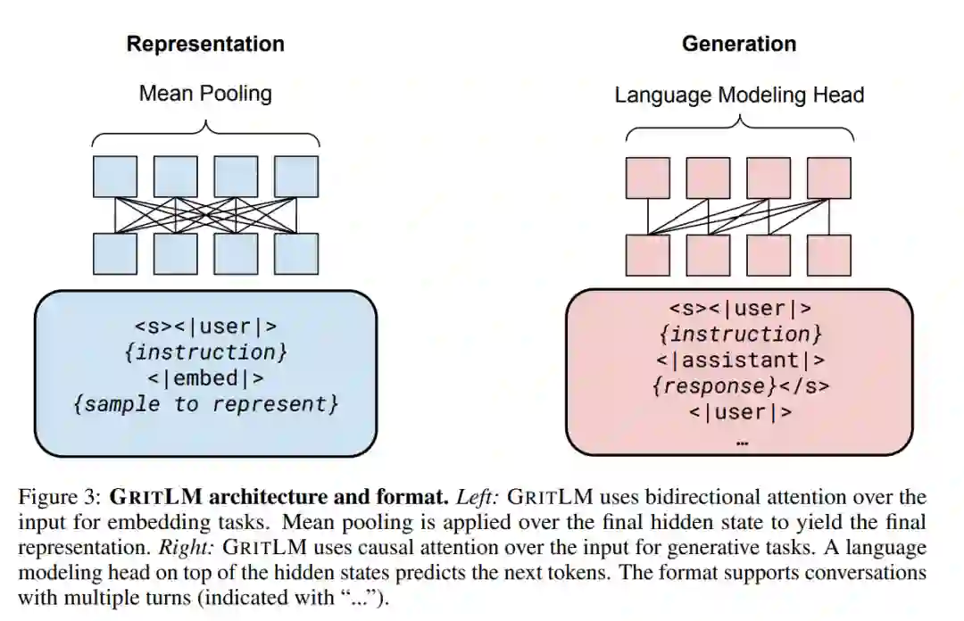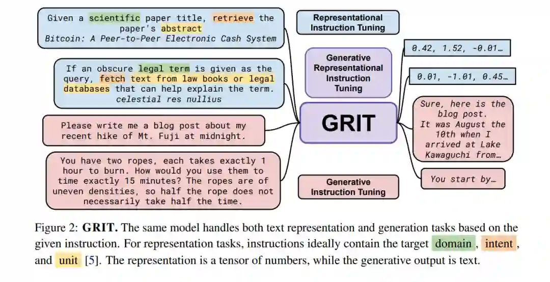 创建一个在广泛任务范围内表现良好的单一通用模型,一直是人工智能领域的长期目标[73, 67, 21, 130, 139]。最近,大型语言模型(Large Language Models, LLMs)已成为单一多任务模型的有希望方向[125, 13]。先前的工作认为,所有基于文本的语言问题都可以简化为生成问题,因此可以通过单一LLM处理[128, 38]。然而,使用嵌入的任务,如聚类或检索[107],从这一视角大多被忽视。如今,文本嵌入支持许多关键的现实世界应用,从搜索引擎到面向用户的聊天机器人[63, 144]。虽然将文本嵌入整合到生成范式中是可能的,通过生成一系列数字来形成嵌入张量,但由于嵌入的高维度和精度要求,这变得不切实际。因此,更常见且更容易的做法是使用模型的隐藏状态作为嵌入表示,这已经是一个数值张量[104, 158, 102]。然而,对当前生成模型这样做会导致性能不佳。例如,虽然T5模型[128, 134]可以以序列到序列的方式处理任何生成任务,但它需要微调才能使其隐藏状态对文本嵌入有用[111, 112],在此过程中它失去了生成能力。我们引入GRIT(生成性表征指令调整),将嵌入和生成任务统一起来,导致一个在两个任务上都表现出色的模型,如图1所示。图2展示了GRIT如何结合两个之前分离的训练范式:(1)生成性指令调整,模型通过生成一个答案来响应指令进行训练[164, 134];和(2)表征性指令调整,模型根据指令代表提供的输入进行训练[143, 5]。通过指令和分离的损失函数,模型学会区分这两种流。我们在高达47B参数的模型上测试我们的方法,并且由于其简单性,我们期望该方法能泛化到任何LLM,甚至非变换器模型。通过GRIT的统一带来了三个优点:a)** 性能**:我们的统一模型匹配了仅嵌入和仅生成变体的性能,甚至在某些任务上超越它们。在7B参数下,GRITLM在开放模型中在Massive Text Embedding Benchmark[107]上设定了新的艺术状态,并同时在生成任务上超越了更大的模型,如Llama 2 70B。通过进一步扩展,GRITLM 8X7B是我们任务平均上最好的开放生成语言模型,同时仅在推理时使用13B参数。此外,由于我们的模型使用滑动窗口注意力[20, 9],它们可以处理任意长度的生成和嵌入输入。b)** 效率**:通常一起使用生成和嵌入模型来弥补彼此的不足[56, 84]。一个这样的场景是检索增强生成(RAG)[84],其中使用嵌入模型检索提供给生成模型以回答用户查询的上下文。这需要将用户查询和上下文传递给生成模型和嵌入模型,共计四次前向传递。有了GRITLM,嵌入和生成模型是等价的,允许我们缓存计算并将所需的前向传递次数减半。我们发现这可以使长文档推理时的RAG速度提高60%以上。c) 简单性:目前,如OpenAI这样的API提供商提供单独的生成和嵌入端点。这需要单独的负载平衡、额外的存储和更复杂的服务软件。一个同时处理两种用例的单一模型显著简化了基础设施需求。GRIT的主要缺点是由于使用两个目标函数进行训练,它需要更多的计算。然而,由于微调与预训练相比成本较低,我们认为好处远远超过这个问题,因此建议构建遵循指令的语言模型的实践者在微调期间采用GRIT。