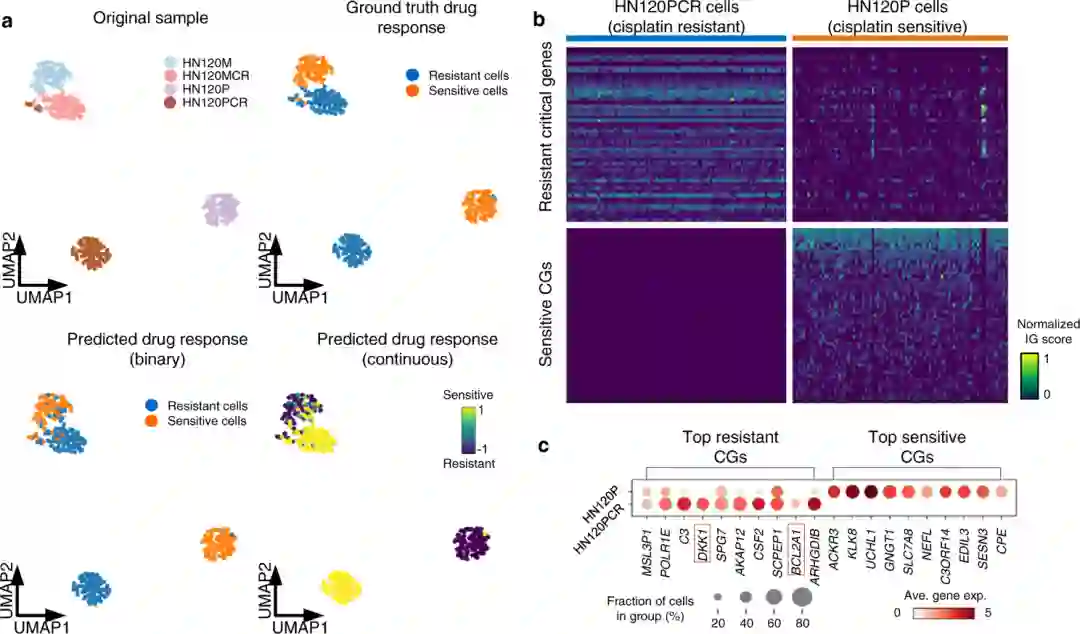scDEAL可以识别负责药物反应的关键基因 尽管scDEAL对单细胞药物反应提供了准确的预测,但对模型中活跃的遗传特征的理解是必不可少的。作者在数据1中对顺铂治疗的口腔鳞状细胞癌(OSCC)进行了scDEAL分析。顺铂通过与DNA上的嘌呤碱基相互作用产生DNA交联来发挥其抗癌活性,干扰DNA复制并导致额外的有害DNA双链断裂,如果不修复,会导致癌细胞凋亡。因此,任何可以增强DNA修复或/和抑制细胞凋亡的因素都能够使癌细胞对顺铂治疗产生抗性。使用scDEAL,85%的细胞被正确预测为对顺铂敏感或耐药 (图4a)。调整后的p值<0.05、log-fold变化<0.1且在任何一个比较组中细胞百分比高于0.2的基因被定义为影响药物反应的关键基因(CG)。在HN120P(敏感细胞组)中识别出936个药物敏感CGs,在HN120PCR(顺铂治疗四个月后的耐药细胞组)中识别出868个耐药CGs,IG评分差异显著(图4b)。作者观察到几种预测最高的抗性CG,例如BCL2A1和DKK1,具有抗凋亡活性(图4c)。已证明这些基因的过表达介导对顺铂的抗性。