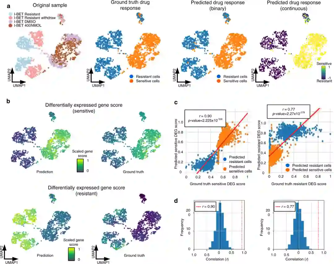 scDEAL在多种I-BET治疗条件下对白血病细胞的的药物反应预测结果良好 作者展示了scDEAL对数据6的分析能力,包括用BET抑制剂(I-BET)处理的1419个混合谱系白血病-AF9(MA9)白血病细胞(图3a)。接下来,引入一个基因评分来反映敏感(或抗性)细胞簇中鉴定的差异表达基因的整体基因表达水平。分数背后的假设是准确的预测会给细胞分配正确的反应标签。因此,用于准确预测的抗性和敏感状态之间的DEGs基因评分应与源自ground truth的DEGs相关。此外,作者的DEG显示的基因评分模式可以比使用真实标签识别的DEG更好地区分抗性和敏感细胞(图3b)。对于敏感的DEG列表,预测的DEG分数与地面真实DEG分数之间的相关性高达R2 = 0.90,对于抗性DEG列表,R2 = 0.77(图3c)。作者进行了经验零模型检验来评估相关性的显著性。随机选择与作者预测的DEG相同数量的基因,并如上所述计算相关性1000次。经验检验(n = 1000)结果显示,对敏感和抗性DEG评分相关性的p值低于0.001,表明作者的相关性显着且具有统计学意义(图3d)。