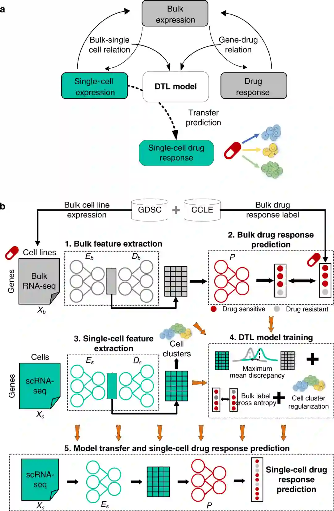 1 简介 癌症的药物治疗因不同状态或细胞命运之间的癌症异质性而导致治疗效率低和复发率高。这种异质性是导致单个细胞对药物产生不同反应的原因,从而导致体内仍存在极少数量的癌性残留物,最终导致癌症复发。单细胞RNA测序(scRNA-seq)技术为发现癌症亚群对特定药物的异质基因表达提供了前所未有的机会。现有的针对bulk数据开发的药物反应预测方法不能直接用于单细胞数据,因此,迫切需要在单细胞水平上开发推断癌症药物反应的计算方法。然而,开发用于预测单细胞药物反应的基于深度学习的工具面临的主要障碍是由于公共领域的基准数据数量有限,训练能力不足。幸运的是,深度迁移学习(DTL)可以将知识和关系模式从bulk数据迁移到单细胞数据中。DTL模型已作为一种有效的策略应用于多个bulk数据进行癌症药物反应预测;然而,到目前为止,其将bulk水平上的知识迁移到单细胞水平上的能力尚未得到充分研究。