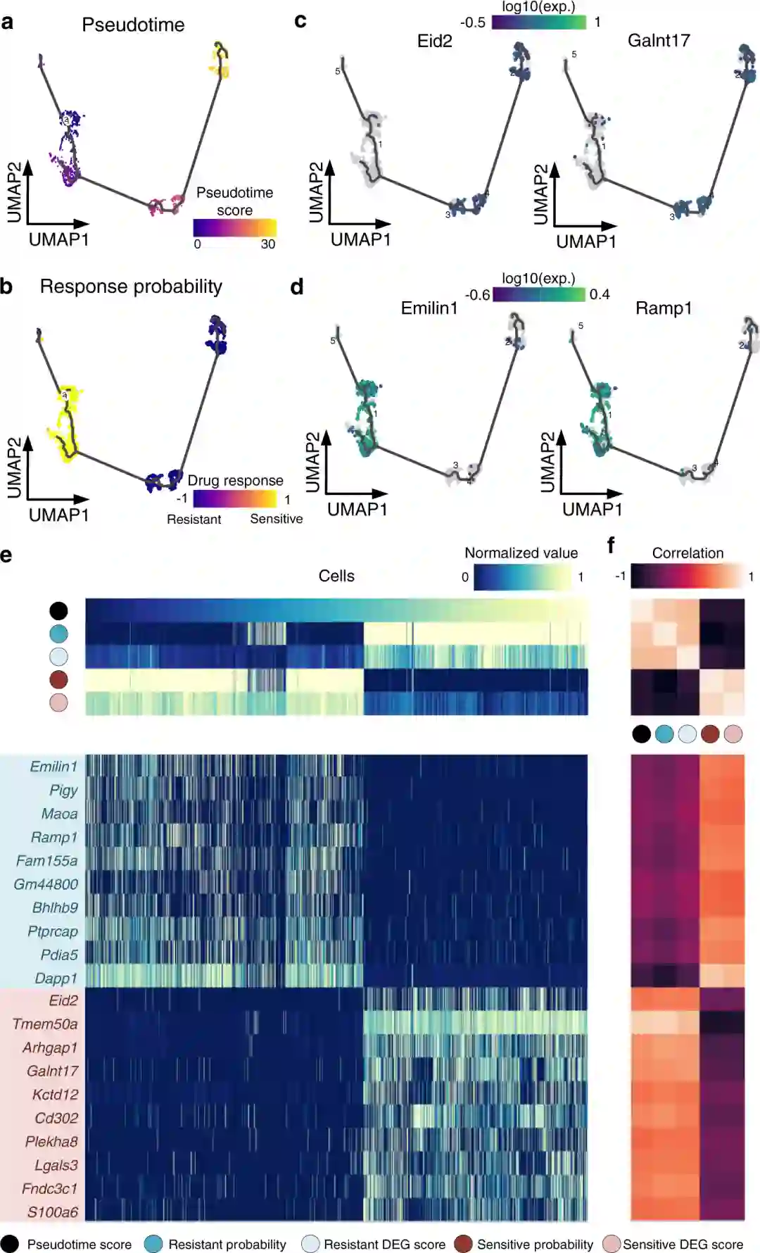 scDEAL药物反应预测与伪时间分析高度相关 应用Monocle3对数据6(用I-BET治疗)进行轨迹推断,以验证作者预测的药物反应是否与药物治疗的进展相关。基于基因表达的伪时间分析显示了从DMSO样品开始向1000ml I-BET治疗样品的轨迹趋势(图5a)。当将伪时间结果与相同扩散UMAP上的药物反应进行比较时,观察到DMSO对照对治疗样品的抗性增加(图5b)。这些结果表明,在高剂量药物后测序的剩余活细胞表现出显着的药物耐受性,这也与实验药物反应标签(ground-truth标签)非常吻合。除了预测和轨迹拓扑之间的一致性外,作者还进一步解释了scDEAL中识别的CG的抗性发展趋势。作者展示了两个代表性的I-BET抗性CG的表达值,即Eid2和Galnt17(图5c),以及两个代表性的I-BET敏感基因,即Emilin1和Ramp1(图5d)。观察到这些基因的表达水平与伪时间分析的轨迹和预测的药物反应概率评分相匹配。