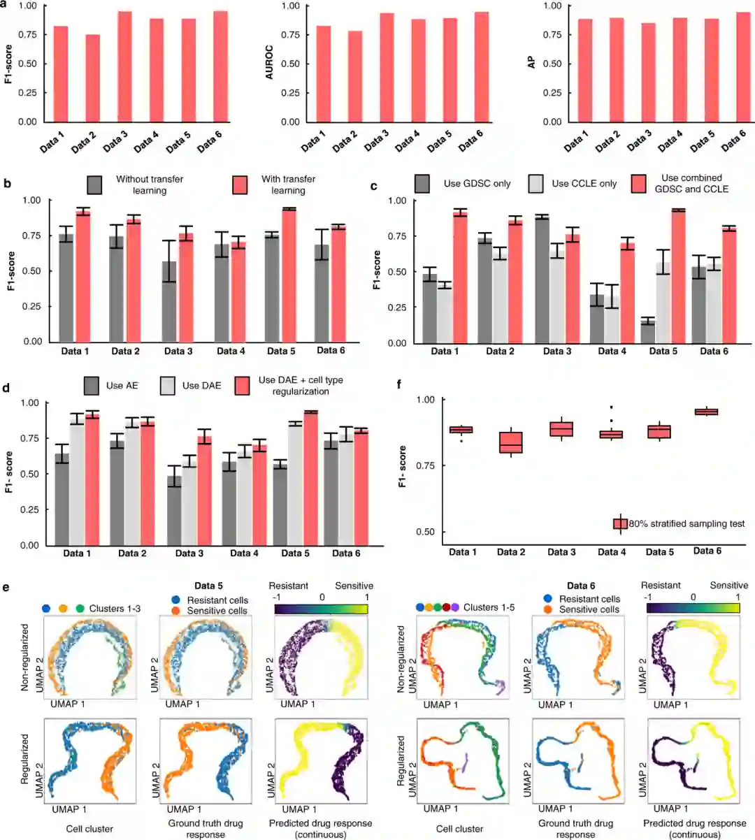 首先,通过仅在bulk数据上训练模型,直接将其用于scRNA-seq数据预测,无需步骤3(迁移学习) ,进行比较测试。对于每个数据,实验重复50次。所有六个数据集的结果显示,与不使用迁移策略相比,使用转移策略时F1得分显着增加(图2b)。比较表明,迁移学习有助于提高单细胞药物反应预测的性能。
