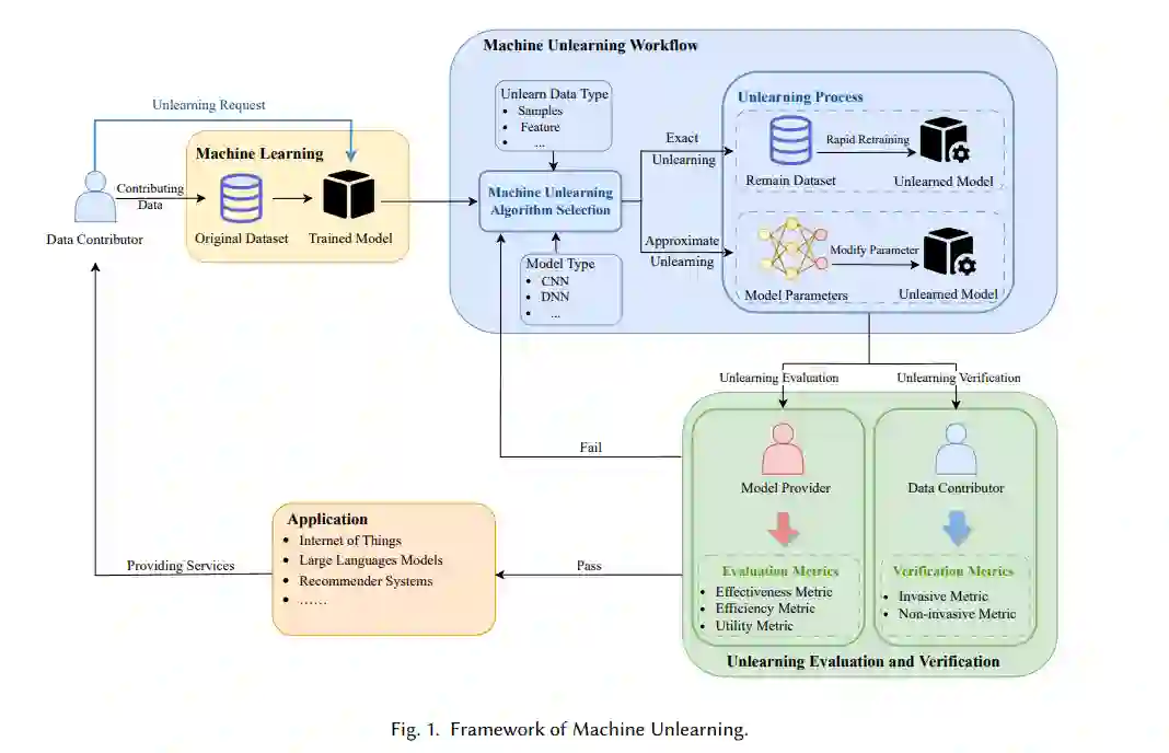 在DL上下文中,仅从后端数据库中删除原始训练数据相对无意义。因为DL模型仍然(显式或非显式地)记住了通常包含请求数据样本的敏感细节的根深蒂固的模式和特征[4, 13]。因此,与DL模型直接相关的原始数据潜在表示似乎是一个挑战,难以直接从DL模型中消除。现有的传统隐私保护技术未能满足这些要求,导致了机器学习中称为机器遗忘(MU)的研究方向的出现。MU使数据贡献者能够主动撤回用于模型训练的数据,旨在从训练好的模型中擦除其影响,就好像它从未存在过一样,而不损害模型的实用性(如图1所示)。