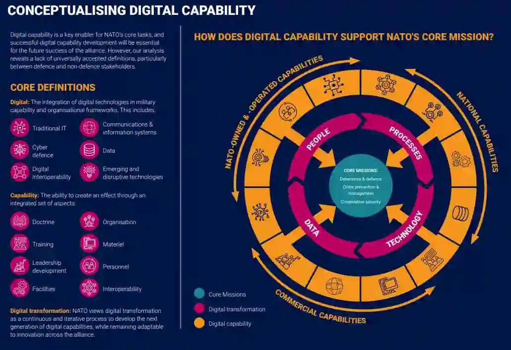 这是探讨数字能力在北约组织中不断演变作用的系列三篇论文中的首篇。本文旨在对"数字能力"及其与"数字化转型"的关系建立更清晰的概念化理解,并分析数字能力如何支撑联盟的核心任务。文件还探讨了数字能力在北约核心任务背景下的作用,包括:威慑与防御;危机预防与管理;合作安全。分析表明,"数字"、"数字能力"及"数字化转型"缺乏普遍认可的定义,尤其在防务领域。因此,主要建议是推动对这些术语的共识理解——这对北约内部以及与工业界、科技界(特别是防务领域新合作伙伴)的有效协作至关重要。