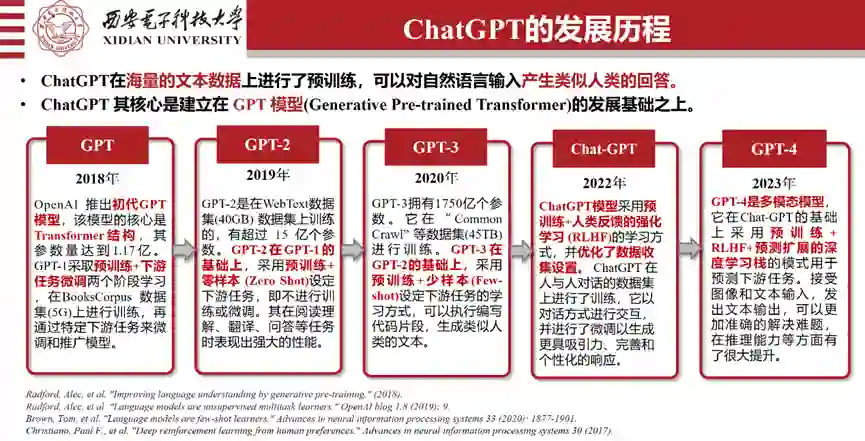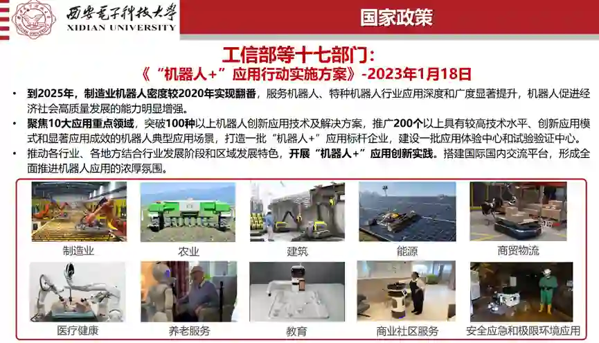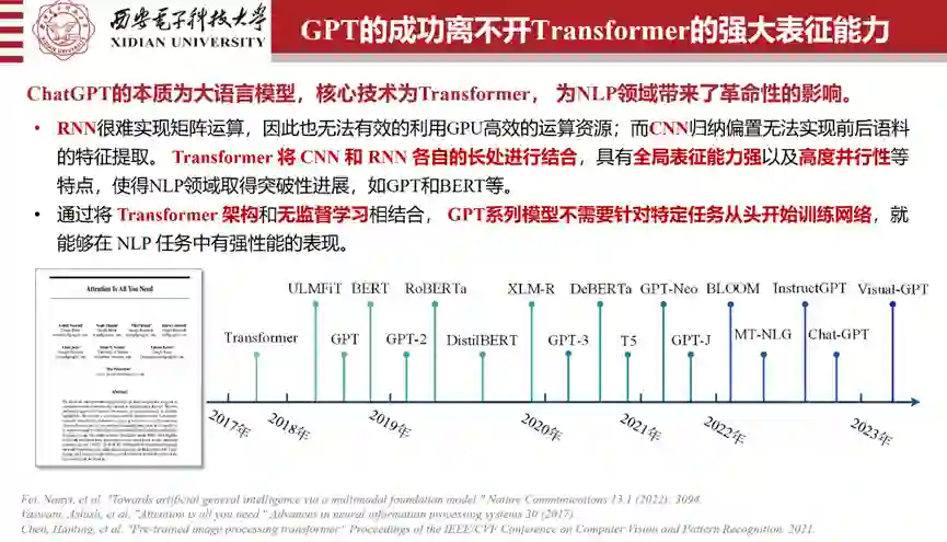 工信部十七部门提出了“机器人+”的这个应用实现的方案,同样也说明了场景应用的重要性。六个部委提出的《关于加快场景创新及人工智能高水平应用的意见》也说明了这一点。教育部出台的2020到2030高等学校人工智能的创新计划,也是从创新体系和学科体系的布局,人才培养综合考虑。同时教育部出台人工智能领域研究生的指导方案,也说明国家对这是非常重视的。而且这些培养方案更要求我们对人工智能领域要有一个全面的认识。ChatGPT所涉及的自然语言处理领域也是必不可少的一部分。经过三十余年的积累,我们团队在教育、科技等方面做了一些我们自己的工作。西电是全国三所人工智能+教育的标杆大学之一,我们希望能够在这个领域对人工智能教育做一些探索。面向国家的战略需求,在遥感领域和医疗领域,研制了类似于ChatGPT这样的应用。从感知人工智能到认知人工智能是一个重大的转变,还有很长的路要走,也涉及到各个方面。**因此,关于****ChatGPT给我们的启发,更需要从源头去创新,从生物机理、物化原理,数学建模、算法设计与优化、硬件设计与实现、开放的环境感知、重大的应用场景等角度,杜绝短板,去全面探索,建立我国全栈式的人工智能生态环境。**谢谢大家!