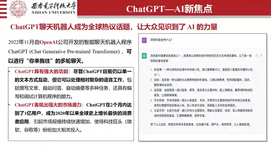 ChatGPT聊天机器人成为全球热议的话题,而且它影响的范围这么广,又掀起的浪潮这么热,**实际上也从另外一个方面让大家看到了人工智能的力量。**简单的讲,聊天机器人是个程序,但是他背后的东西或者说他能够给我们带来的启示可不是这么简单。也就是说ChatGPT本身所具有的功能是怎么为我们服务的。或者说它在哪些方面跟我们互动,特别是ChatGPT为什么能够对市场有这么大的触动。而且它在短短的两个月之内就达到了一亿的用户。也成为2020年以来全球史上消费者增长最快的应用系统。我们搜了一个“陕西的美食有什么?”搜的是中文,应该说它至少库里这些东西都有,而且还比较准。其实多位产业界的各种领袖或多或少的对这一新的变革给出了肯定性的评价。马斯克说实际上ChatGPT向人们展示出人工智能有多么的先进。而比尔·盖茨也讲,ChatGPT像互联网发明一样的重要,它也将会改变世界。黄仁勋说的是ChatGPT是人工智能的iPhone,实际上ChatGPT是从量变到质变的长期积累的工作过程。同时ChatGPT的“狂飙”也将推动产业的变革与模式的更新。 这次“两会”也是引起了广泛的热议和关注。我们想说的是:不是说简简单单ChatGPT的技术本身,而是它的应用,如何应用人工智能,给市场、产学研的创新和应用注入新的活力。同时如何去捕捉到这个机遇,迎来新的一场变革。ChatGPT给人工智能商业化带来的契机是前所未有的。**这个契机一个方面是商业化的应用市场,另一方面是它会刺激许多领域的技术创新。**虽然说ChatGPT还很初步,还有许多有待完善的地方。但是它促使相关技术的产生或者变革的这种动力,怎么估计也不过分。欧亚科学院院士李世鹏谈到,它现在处在初步的阶段,部分能力也有待提高。加拿大工程院的外籍院士原京东副总裁,IEEE Fellow梅涛说道,其实它可能更会触动视觉生成技术。视觉生成技术已经处于应用爆发的前夜。当然一个方面说明了ChatGPT现在的缺陷,另外也说明了它的推动作用,以及将来发展的前景。其实人工智能或者ChatGPT成为现在投资的热点方向之一,也说明了这个问题。**尽管ChatGPT取了一定胜利,但是要仔细的去分析它,在趋势上、在技术上、在变革上、在机会和应用上,为什么会这样。**ChatGPT为人机交互注入了新的活力,也就是说我们能够做出类人的或者类脑的人工智能的应用系统。但是它的基础研究仍然需要加强。那么人工智能的创新,我们到底应该往哪里走?我们还需要去在哪方面去发力?这件事情值得我们大家去思考。我个人认为人工智能ChatGPT为什么能引起产业界市场这么大的反应,作为一个教育工作者,更应该从学术上去再思考,再认知,使得ChatGPT的发展更加健康,更加有序,而且底子更厚,基础更扎实,前行的步伐更稳。实际上,现在的ChatGPT远远还没有达到真正类人的那种程度,还不具备创造性工作的能力,同时它也不可能代替人类的思考。金耀初院士指出,ChatGPT的出世非一日之功,但是仍然尚不具备自主的心智,ChatGPT不是万能的,但是未来的各种突破是可能的。吴飞教授指出ChatGPT是一个现象级的产品,但本质上它仍然是以深度学习为代表的人工智能技术长期发展积累的结果。距离真正模拟人类的思维还非常的遥远。张军平教授也谈到ChatGPT只是看起来具有人的心智,但并不具有人的心智。所以说ChatGPT是技术上的进步,是技术上的变革,也是技术上的推动。但是它仍然处于初级阶段,目前它只能作为工具辅助人类工作,而不能代替业务。那言下之意就是说仍然有很大的发展空间,需要我们做长期的、艰苦的、扎实的、基础性的工作。ChatGPT作为人工智能颠覆性技术革命的一个引子和代表。王志刚部长更是讲到ChatGPT从源头看来是自然语言的理解、自然语言处理两个方向的技术,而不是人工智能的全部。它是一个大模型,对大数据和算法依赖性很强。但是对更多更复杂的场景任务,怎么样通过场景驱动技术迁移,去实现产学研的相结合,做出颠覆性的工作?