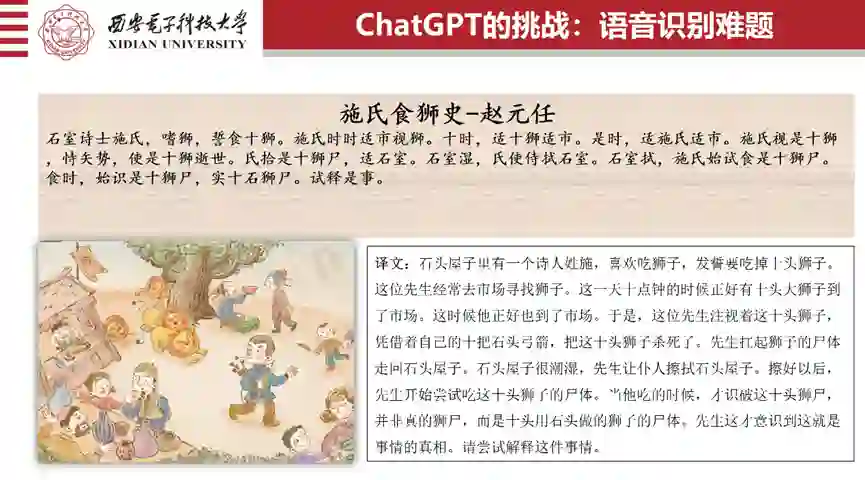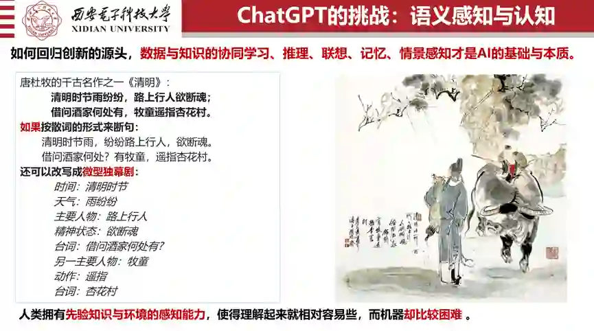 目前ChatGPT的数学基础、数理逻辑都有待提高。ChatGPT给我们带来的挑战是前所未有的,变革也是前所未有的。如果回到人工智能的源头,我们对数据和知识的协同学习、推理、联想记忆、情景感知怎么做?ChatGPT能有多少是我们得到满意的结果?而这些恰恰是人工智能的基础和本质所在。唐朝诗人杜牧的千古名作《清明》,实际上给我们很大的启示。这首诗它蕴含的意义ChatGPT能理解多少,这首诗的内涵和意义能理解多少。“清明时节雨纷纷,路上行人欲断魂。借问酒家何处有,牧童遥指杏花村”。这个就表现出了现在ChatGPT有多少对情感内涵的理解能力。我们对先验知识,对环境的感知能力,有多少能够去像人们要求的那样,非常舒适的去应用和理解。ChatGPT的训练数据主要是互联网上的对话文本,那这个时候对文本可能存在偏见,例如性别、种族、地理。其实所有的知识,那怎么去处理、实际应用系统中怎么样去减少、或者说弱化这些偏见的影响,如何进行数据和知识的协同学习,如何做个更好的、合理的、符合实际情景的决策,依然是人工智能本质性的问题和基础性的问题。大家知道语音识别的难题也是这个。这里有一首写的非常好的文章,赵元任先生的《施氏食狮史》所有的词都是一个音。那语音识别怎么去听,或者说语音识别对这一类问题应该和什么技术结合起来进行解释。