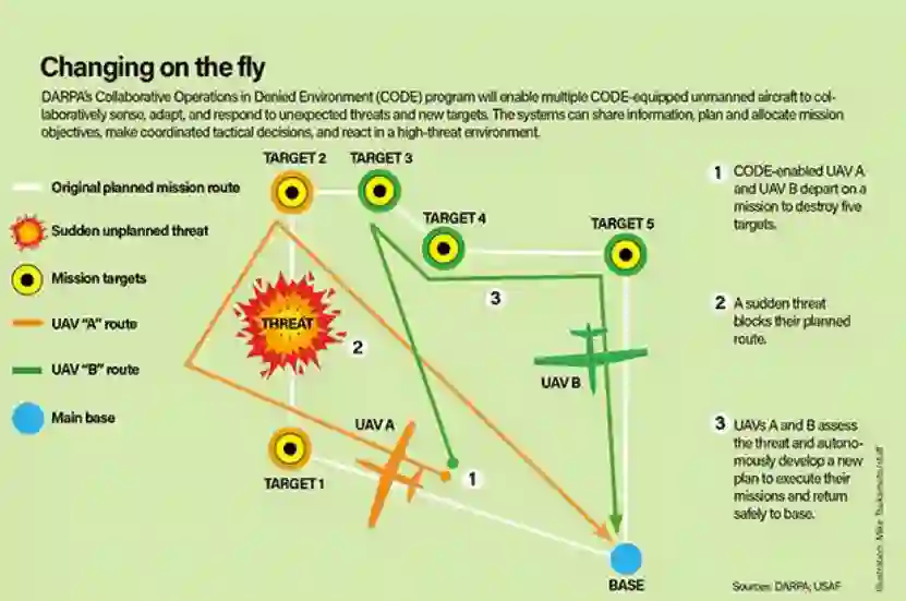 在飞行中改变。DARPA的 "拒止环境中的协作行动"(CODE)计划将使多个配备CODE的无人驾驶飞机能够协作地感知、适应和应对意外的威胁和新目标。这些系统可以共享信息,计划和分配任务目标,做出协调的战术决策,并在高威胁环境中做出反应。