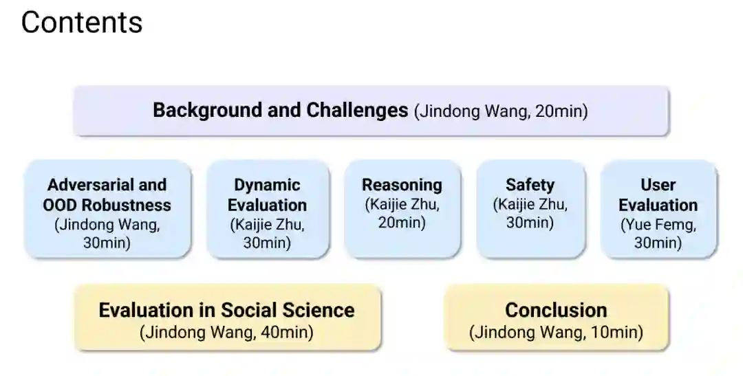 随着大型语言模型(LLMs)的快速发展,关于其安全性和风险的担忧日益增加,这主要源于对其能力和局限性的理解不足。在本教程中,我们的目标是通过呈现全面的LLM评估概述来填补这一空白。首先,我们从“什么”、“哪里”和“如何评估”这三个角度,讨论了LLM评估的最新进展。接着,我们介绍了LLM评估中的几个关键挑战,如数据污染和固定复杂度。基于这些挑战,我们介绍了如何克服这些问题。之后,我们展示了如何在不同的下游任务中评估LLMs,包括自然科学和社会科学,接着是一些流行的代码库和基准测试。我们希望学术界和工业界的研究人员继续努力,使LLMs更加安全、负责任和准确。 https://llm-understand.github.io/
