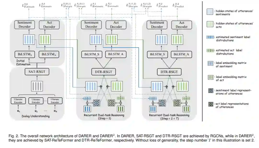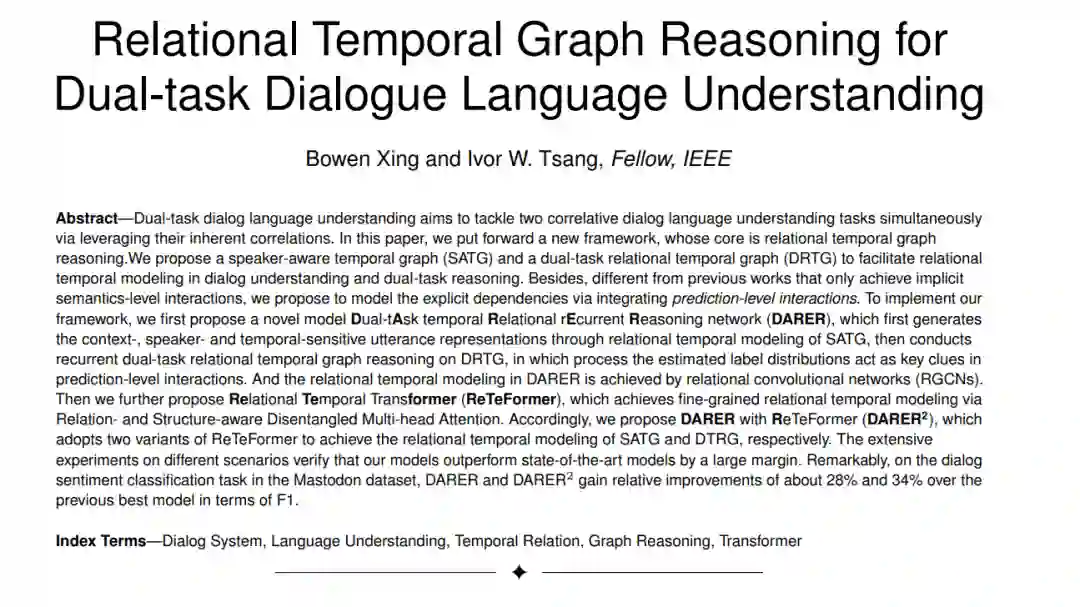 双任务对话语言理解旨在通过利用它们之间的内在联系,同时解决两个相关的对话语言理解任务。在本文中,我们提出了一个新的框架,其核心是关系时态图推理。我们提出一个以说话者为中心的时态图(SATG)和一个双任务关系时态图(DRTG)来促进对话理解中的关系时态建模和双任务推理。此外,不同于以前的工作只实现隐含的语义级交互,我们建议通过整合预测级交互来模拟显式依赖关系。为了实现我们的框架,我们首先提出了一个新颖的模型,双任务时态关系递归推理网络(DARER),它首先通过SATG的关系时态建模生成上下文、说话者和时态敏感的话语表示,然后在DRTG上进行递归的双任务关系时态图推理,其中估计的标签分布作为预测级交互的关键线索。DARER中的关系时态建模是通过关系卷积网络(RGCNs)实现的。然后,我们进一步提出关系时态变换器(ReTeFormer),它通过关系和结构感知的解耦多头注意力实现了细粒度的关系时态建模。因此,我们提出了带有ReTeFormer的DARER(DARER2),它采用两种ReTeFormer的变体分别实现SATG和DTRG的关系时态建模。在不同场景的广泛实验中验证了我们的模型以很大的优势超越了最先进的模型。