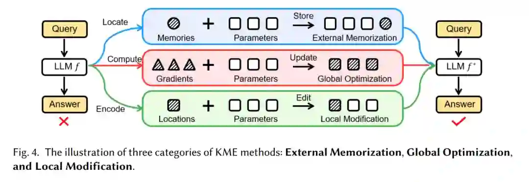 面对旧信息的快速折旧和新知识的出现,各种KME方法已经被提议来更新预先训练的LLMs,以保持它们的最新性和相关性。KME确保新知识能够高效地融入预训练的LLMs,而不会负面影响与编辑无关的预训练知识。 在这份调查中,我们将现有的KME方法分为以下三个主要类别: