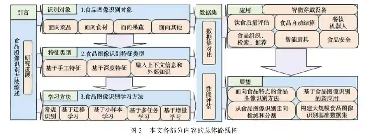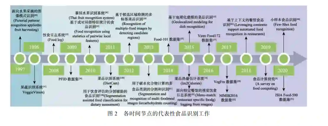 食品与人类的行为、健康和文化等密切相关. 社交网络、移动网络和物联网等泛在网络产生了食品大数 据,这些大数据与人工智能,尤其是快速发展的深度学习催生了新的交叉研究领域食品计算. 作为食品计算的核 心任务之一,食品图像识别同时是计算机视觉领域中细粒度视觉识别的重要分支,因而具有重要的理论研究意义, 并在智慧健康、食品智能装备、智慧餐饮、智能零售及智能家居等方面有着广泛的应用前景. 为此,本文对食品图像识别领域进行了全面综述. 该文首先从识别对象、视觉特征表示及学习方法等不同维度对目前的食品图像识 别进行分类并深入阐述和分析了当前的研究进展,指出深度学习模型是当前食品图像识别的主流方法,融入各种 上下文信息和外部知识是改进食品图像识别的重要手段. 其次从食品数据规模、食品类型及是否包含上下文和多 模态信息等方面介绍了现有的食品图像识别数据集,并给出了不同识别方法在主流数据集上的性能对比和分析. 接下来总结了食品图像识别在饮食质量评估、食品自动结算、智能厨具、食品图像的组织检索和推荐等多个方面 的应用情况. 最后本文从面向食品特点的食品图像识别方法、大规模食品图像识别基准数据集构建等方面对食品 图像识别未来可能的研究方向进行了总结和展望.