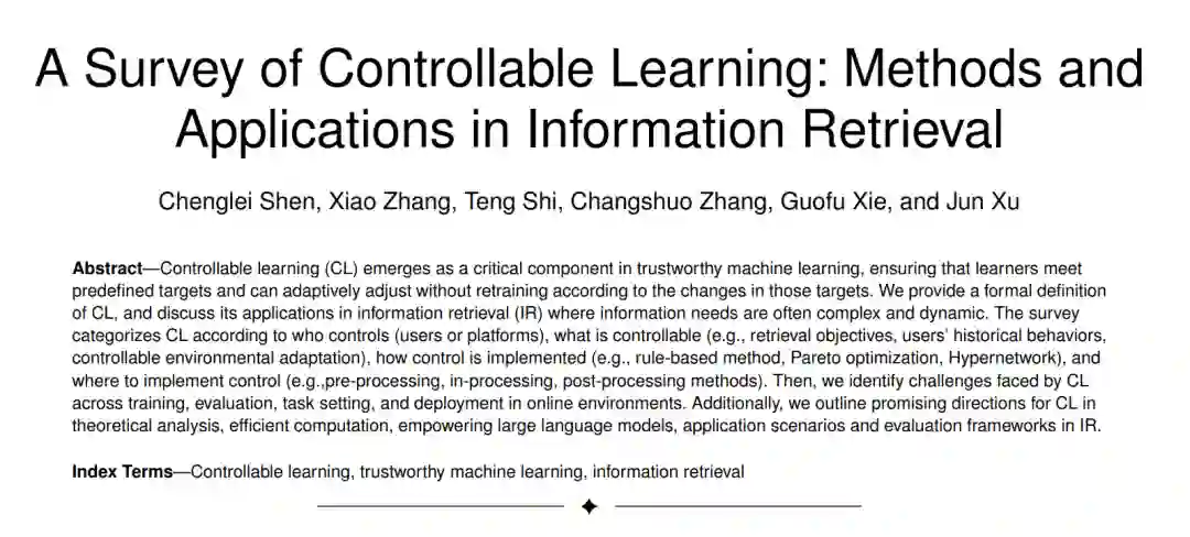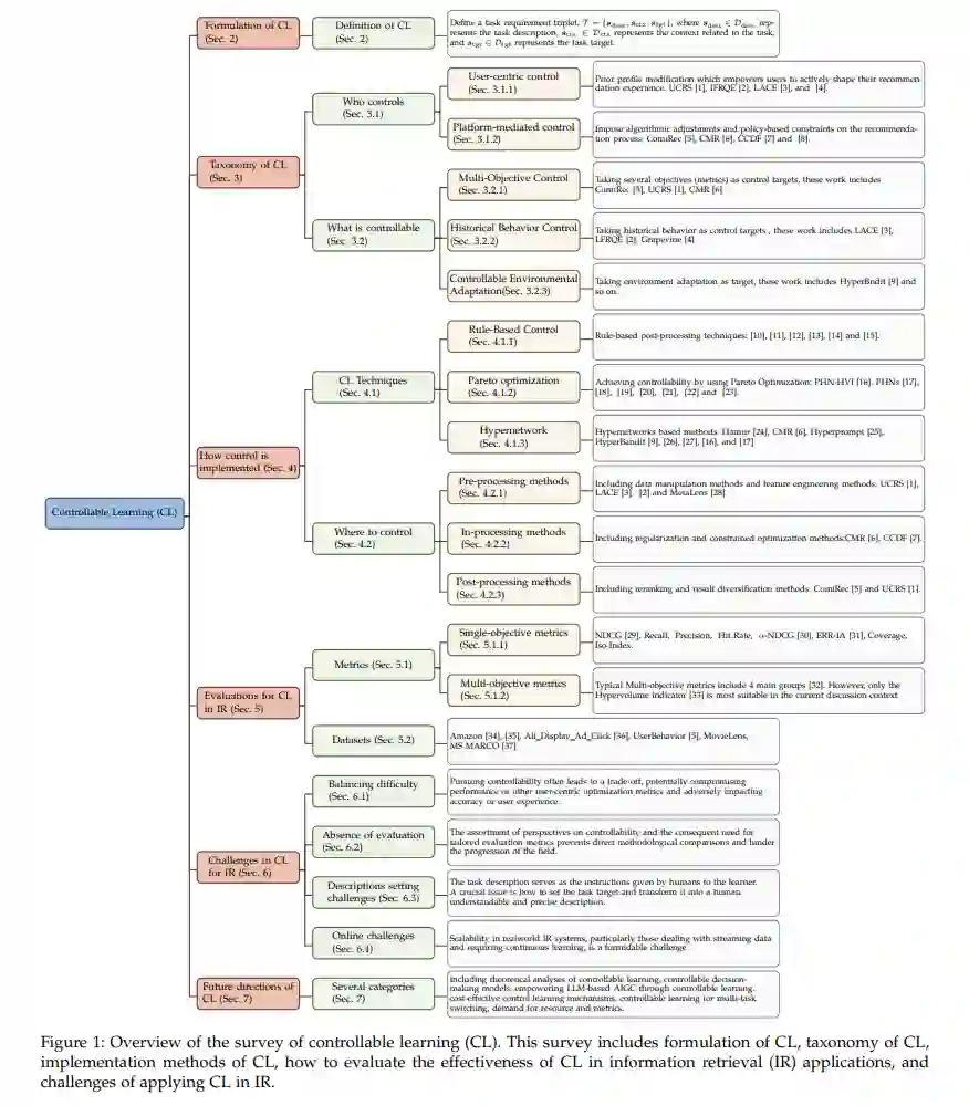 可控学习(Controllable Learning,CL)作为可信机器学习的关键组成部分,确保学习者能够满足预定义目标,并且能够根据这些目标的变化自适应调整而无需重新训练。我们提供了CL的正式定义,并讨论了其在信息检索(Information Retrieval,IR)中的应用,因为信息需求通常是复杂且动态的。该调查根据控制者(用户或平台)、可控内容(如检索目标、用户的历史行为、可控的环境适应)、控制的实现方式(如基于规则的方法、帕累托优化、超网络)以及控制的实施位置(如预处理、处理中、后处理方法)对CL进行了分类。然后,我们识别了CL在在线环境中的训练、评估、任务设置和部署方面面临的挑战。此外,我们概述了CL在理论分析、高效计算、增强大语言模型、应用场景和评估框架在IR中的有前途方向。
