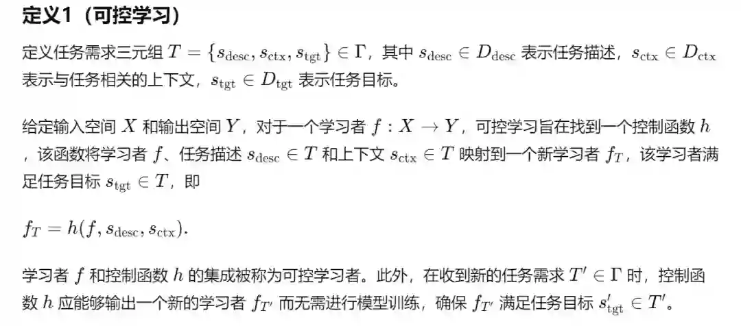 在本节中,我们首先从任务需求的角度给出可控学习的正式定义,并描述可控学习的过程。 可控学习的概念在各种AI研究方向中都有体现,但目前缺乏统一的正式定义。为了明确表达可控学习的组成部分并统一现有的可控学习方法,我们首先从任务规范的角度定义可控学习。简而言之,可控学习是找到能够适应不同任务需求的学习者的能力,而无需重新训练,从而满足预期的任务目标,如定义1中详细描述。
