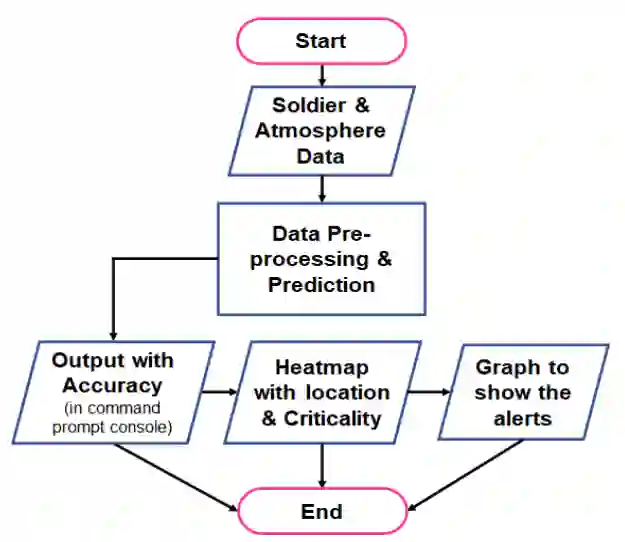 从军队人员和基站点实时收集的传感器数据有助于不断监测环境和人的健康状况[7]。该研究旨在为基站提供有关军队人员健康和资源管理的信息优势。由此,分析武装人员的位置和资源可用性,用红色(高)、橙色(中)和绿色(好)等颜色绘制他们的健康和基站点,表示困难强度。这使得控制室能够与部队进行导航和协调[10]。这些通信的主要问题是,由于恶劣的天气、大雾、高海拔等因素,信号可能会丢失。在这种情况下,军队人员呆在高海拔地区和恶劣的天气条件下,会被证明是致命的。这项工作建议使用传感器设备监测军队人员所在地的天气状况,并不断将这些信息反馈给机器学习模型[11]。然后,这个ECRAM模型将分析给定的数据并预测确切的情况,并将其显示在热图上,画出时间与资源信息的当前状态的图。当局可以利用该框架进行有效的部署,并了解其部队在某一特定时间点的理想状态[12]。这使用了随机森林算法来准确分析数据并预测武装人员的状况。它还进一步测试了影响单个士兵的大气参数,并分析了资源的可用性和维护。