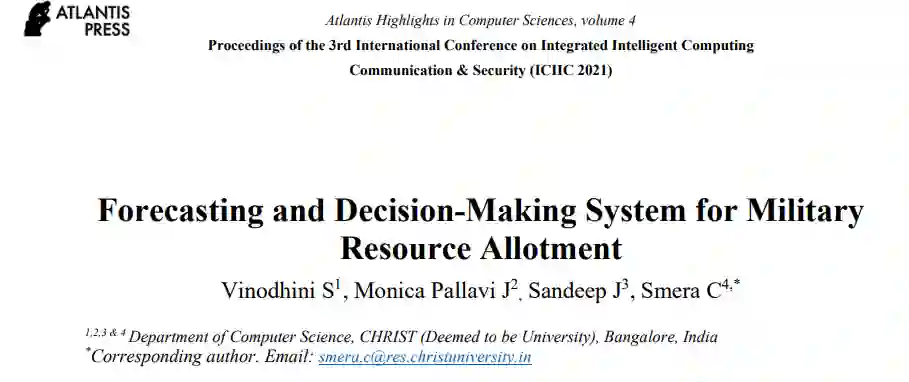 在资源分配方面做出适当的决定是军事当局的一项重要任务。在向军事人员提供帮助的同时,这些决定有可能危及生命。在决策支持系统的帮助下,这种人工系统已经得到了加强,该系统是在现场传感器收集的数据上实施的。所提出的基于环境条件的军事资源分配(ECRAM)模型有助于指挥官在处理任何不确定因素时做出快速决策。结果显示,随机森林分类器的模型准确率约为94.4%,通过使用大量的数据进行训练可以进一步提高。这一结果还可以通过更精确地清理数据和包括到位的认证系统来加强。