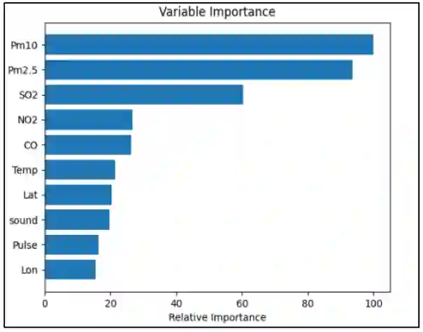 该研究还显示了相对变量在特定环境中的重要性,如图5所示。可以看出,根据死亡原因的数量,Pm10和Pm2.5在环境中具有较高的重要性。