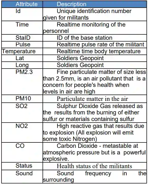 这项工作还扩展到实时可视化数据。示例:放在武装人员身上的可穿戴电化学传感器捕捉到空气中的毒性,这意味着在那个特定的时间里,地理点被捕捉到,并强调有可能发生炸弹爆炸,指挥官应该发送必要的医疗援助来帮助那些在该地点的士兵。这项工作还实现了各种机器学习算法进行比较分析。