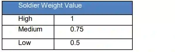 如表2、表3和表4所示,多种外部因素影响着士兵的权重值。模糊逻辑使用九个模糊规则来计算重量值,如表5所示。这些数值在决策中发挥了作用,因为计算是在这种关键环境下考虑的。