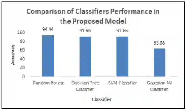 基于四个模型的实施,对新的数据采取了结果,并在图4中呈现。它显示了所有四个分类器在ECRAM模型中的实验表现。该图是在准确率和分类器之间绘制的。根据实验结果,随机森林分类算法与所提出的ECRAM模型相比具有最高的准确性。