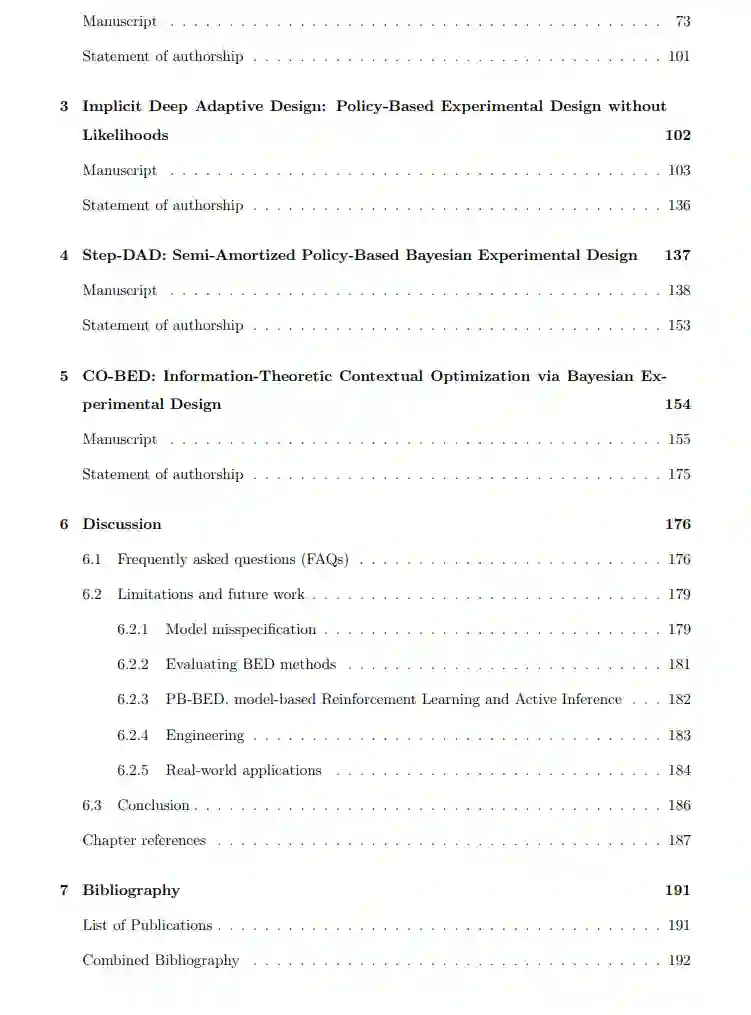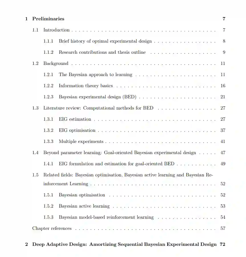 贝叶斯实验设计(BED)提供了一个原则性数学框架,用于设计实验以高效学习感兴趣的现象。本论文聚焦于信息论的贝叶斯实验设计,采用期望信息增益(EIG)作为设计标准。最大化 EIG 确保收集到的数据对于潜在的科学问题或假设是最具信息量的。这一方法有潜力显著提高数据采集的质量和效率,从而解决高成本、时间限制和资源有限等关键挑战。 尽管潜力巨大,BED 的实际应用历来受到显著计算挑战的限制。主要挑战在于计算 EIG,对于大多数现实问题而言,这是不可行的。此外,自适应实验设计利用从先前实验中获得的信息来指导后续实验的设计,这进一步增加了计算复杂性。 本论文专注于开发可扩展且计算效率高的贝叶斯实验设计方法,以克服这些挑战。我们引入了一种新方法称为基于策略的贝叶斯实验设计(PB-BED),它利用深度学习充分摊销自适应实验设计的成本,实现实时设计决策。此外,我们还引入了一种半摊销的方法,允许在实验过程中根据实际收集到的数据对设计策略进行定期优化。这种方法增强了 PB-BED 框架的适应性和稳健性,确保随着新信息的收集,设计策略保持最佳状态。 最后,我们引入了一个统一的与模型无关的框架,用于利用信息论原则设计大规模的上下文实验。本论文的贡献代表了朝着自动化和可靠的实验设计策略迈出的一步,这些策略有潜力加速科学发现,改善各个领域的数据驱动决策。 数据在现代世界中扮演着关键角色,成为科学发现和工业进步的基础。近年来,基于大型数据集训练的复杂统计模型被越来越多地用于以自动化和自主的方式指导决策过程(Araujo et al., 2020; Bogert et al., 2021; Adlung et al., 2021)。然而,用于训练这些模型的数据质量和相关性可能差异显著。数据集可能受到噪声、冗余或偏见的影响,或者可能不直接适用于特定的任务。当模型在次优数据上进行训练时,它们往往会继承甚至加剧其中存在的偏见和局限性。结果,模型可能产生偏见的分析和预测,这可能导致误导性的结论和糟糕的后续决策(Barocas and Selbst, 2016; Corbett-Davies et al., 2017; Ntoutsi et al., 2020; Paullada et al., 2021; Mehrabi et al., 2021; Budach et al., 2022)。因此,高质量和相关数据在现代数据驱动的环境中是一项无价的资产(Hutchinson et al., 2021; Paleyes et al., 2022; Priestley et al., 2023)。 在某些情况下,数据完全由外部来源生成,无法控制数据获取过程,必须按原样使用现有数据。然而,在许多情况下,有机会影响数据获取过程,从而有可能提高收集数据的质量。这些机会包括仔细选择调查问题、为药物发现试验选择有前景的化合物、对实验室设备进行校准以实现精确测量,以及在机器学习任务中战略性地选择注释数据点。这些可控变量为最大化获取数据的有效性和质量提供了关键机会。这个受控的数据获取过程可以通过最优实验设计的视角进行形式化(Fisher, 1935; Ryan and Morgan, 2007)。在这项工作中,我们采用贝叶斯实验设计的方法(Lindley, 1956; Chaloner and Verdinelli, 1995; Ryan et al., 2016; Rainforth et al., 2024),因为它提供了一个统一、连贯且自洽的框架。贝叶斯实验设计(BED)是一个基于模型的框架,能够有效整合所有可用信息,使其在多步骤自适应实验设置中尤其有利,在这些设置中,决策是随着不完整信息的顺序进行的。这使得对模型进行一致的更新成为可能,确保每个决策都与对实验系统的不断演变的理解相一致。
