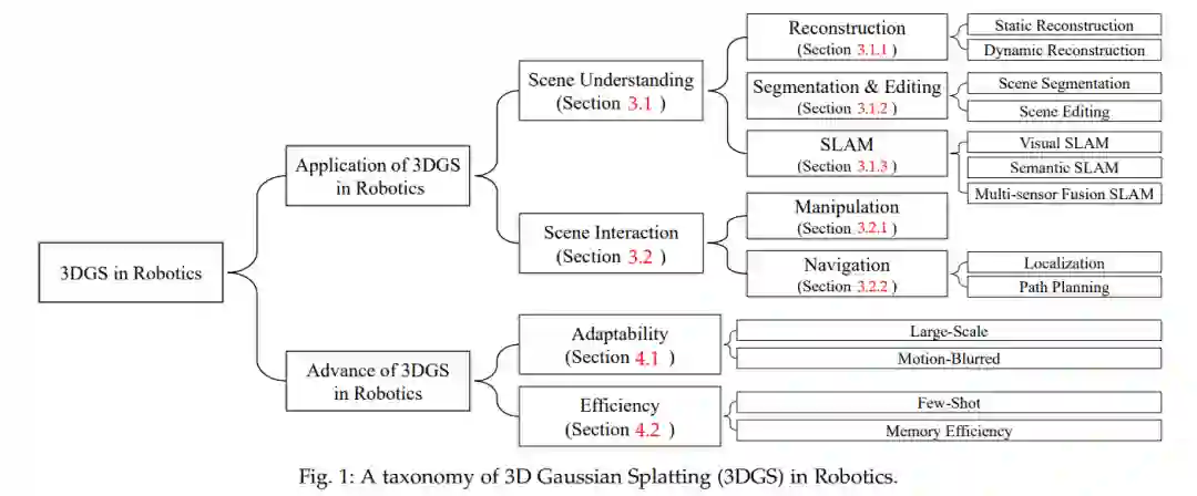 神经辐射场(NeRF)的出现推动了机器人领域的发展,特别是在感知、场景重建和环境交互方面提升了机器人的能力。然而,这种隐式表示在优化过程中,由于逐像素光线投射渲染的低效性而受到限制。三维高斯溅射(3DGS)的出现通过其显式表示解决了这一效率问题,并通过溅射实现了高质量和实时渲染。具体来说,3DGS使用一组具有可学习参数的高斯基元来建模环境,为场景提供显式表示。在渲染过程中,3DGS通过溅射将三维高斯映射到给定摄像机位置的二维图像空间,并使用基于切片的光栅化器进行加速,从而实现了实时性能。因此,3DGS在提升机器人系统性能和扩展其能力方面具有更大的潜力。自2023年3DGS问世以来,已有多篇综述论文[4]、[5]、[6]、[7]、[8]、[9]展示了该领域的发展。Chen等人[4]首次综述了3DGS的发展历程和关键贡献。Fei等人[5]提出了一个统一框架,用于对现有3DGS工作进行分类。Wu等人[7]则提供了一份包含传统溅射方法与新兴的基于神经网络的3DGS方法的综述,展示了3DGS溅射技术的发展。Bao等人[9]基于3DGS技术提供了更详细的分类。此外,Dalal等人[6]聚焦于3DGS中的三维重建任务,而Bagdasarian等人[8]则总结了基于3DGS的压缩方法,展示了3DGS在特定领域的优势与不足。然而,现有的3DGS综述要么对3DGS工作进行广泛的分类,要么聚焦于3DGS的实时视图合成,缺乏对机器人领域的详细总结。因此,在本文中,我们对机器人领域中的3DGS进行了全面总结和详细分类。我们介绍了3DGS在机器人中的应用,并详细分类了与机器人应用相关的3DGS研究。此外,我们总结了增强3DGS表示以适用于机器人系统的潜在解决方案。最后,我们展示了基于3DGS的工作的性能评估,并讨论了3DGS在机器人领域的未来发展。本综述的整体框架如图1所示。第二部分简要介绍了3DGS的核心概念和数学原理。第三部分将3DGS在机器人中的各种应用方向进行分类,并详细介绍了相关工作的分类。第四部分讨论了改进3DGS表示以增强其在机器人任务中的能力的各种进展。此外,在第五部分中,我们总结了用于3DGS机器人应用的数据集和评估指标,并比较了现有方法在不同机器人方向上的表现。第六部分探讨了3DGS在机器人领域的挑战和未来方向。最后,第七部分总结了本次综述的结论。