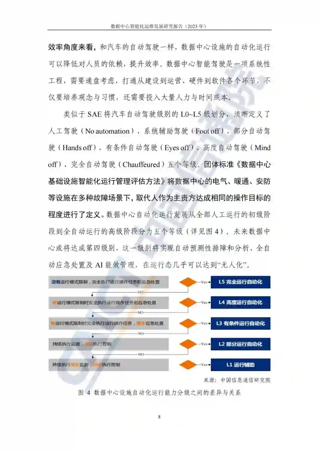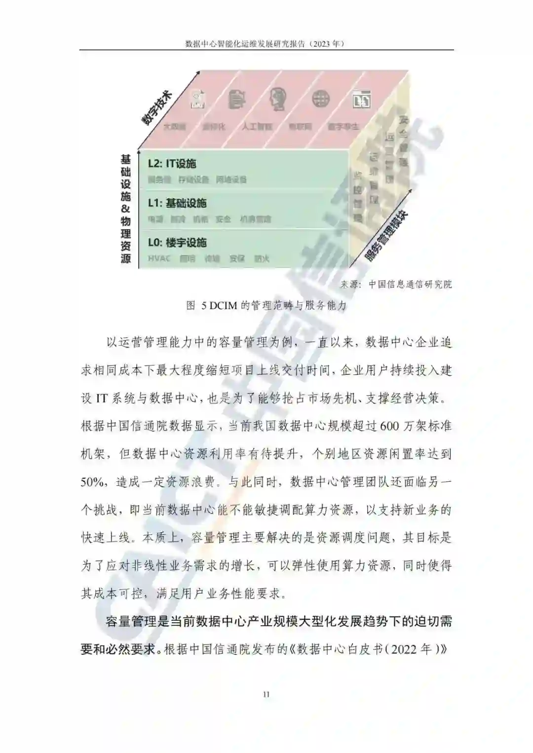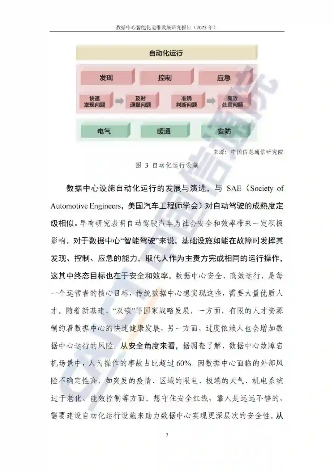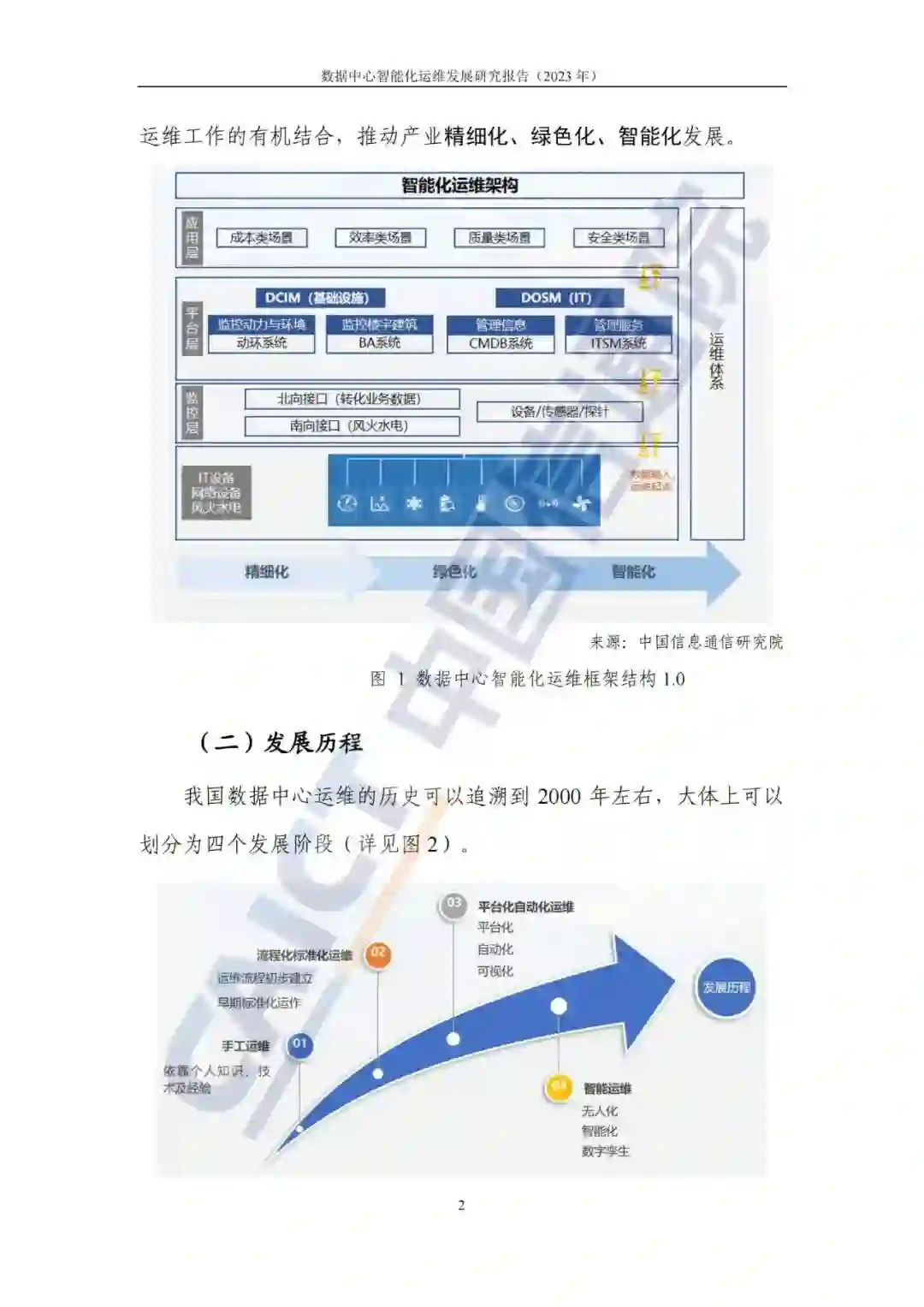 新型数据中心是支撑 5G、云计算、人工智能等新一代信息技术发展的算力载体,是推动经济社会数字转型、智能升级、融合创新的关键基础设施。随着以高技术、高算力、高能效、高安全为代表的“四高”成为产业发展新目标,智能化作为新型数据中心高技术的重要体现,已经成为新型数据中心的重要发展趋势。 为切实引导新型数据中心加快向“高技术”发展,本报告聚焦新型数据中心智能化运维的基础性研究。分阶段回顾了我国数据中心运维发展历程,对智能化运维的基本概念、发展历程等进行分析,深化产业认识,激发发展共识;首次提出智能化运维发展的三大目标和理念,体现产业界发展理念与体系的创新升级;总结分析智能化运维的发展核心——即设施、平台、体系、服务的发展态势,明晰智能化运维对于产业界的价值。报告意在为行业实现高技术、高质量发展提供有益参考,希望能对从业者有所启示。数据中心智能化运维相关产业、技术正处于高速发展阶段,新技术生态瞬息万变,我们的认识有待深化迭代。