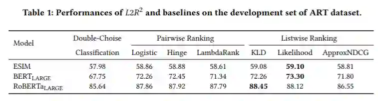 外展自然语言推理任务(αNLI)提出了评价诱导的学习系统的推理能力。对于αNLI任务,两个观测给出最合理的假设被要求选出的候选。现有的方法简单地将其表示为一个分类问题,因此在训练过程中使用了交叉熵对数损失目标。然而,区分真假并不能衡量一个假设的可信性,因为所有的假设都有发生的机会,只有概率是不同的。为了填补这个空白,我们切换到一个排序的角度,按照假设的可信性排序。在此基础上,提出了一种新的基于学习排序的L2R2方法。首先,将训练样本重新组织成一个排序形式,将两个观察值及其假设分别作为查询和一组候选文档。然后,得到一个ESIM模型或预先训练好的语言模型,如BERT或RoBERTa,作为打分函数。最后,对于训练,排序任务的损失函数可以是成对的,也可以是列表式的。在ART数据集上的实验结果达到了公共排行榜上的最高水平。