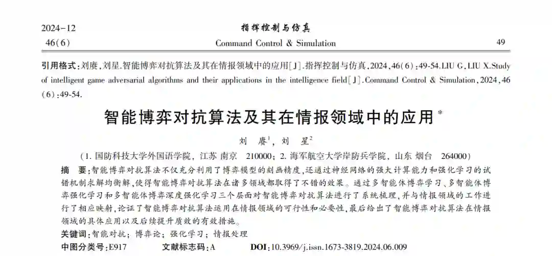 智能博弈对抗算法不仅充分利用了博弈模型的刻画精度,还通过神经网络的强大计算能力和强化学习的试 错机制求解均衡解,使得智能博弈对抗算法在诸多领域都取得了不错的效果。 通过多智能体博弈学习、多智能体博 弈强化学习和多智能体博弈深度强化学习三个层面对智能博弈对抗算法进行了系统梳理,并与情报领域的工作进 行了相应映射,论证了智能博弈对抗算法运用在情报领域的可行性和必要性,最后给出了智能博弈对抗算法在情报 领域的具体应用以及后续提升质效的有效措施。