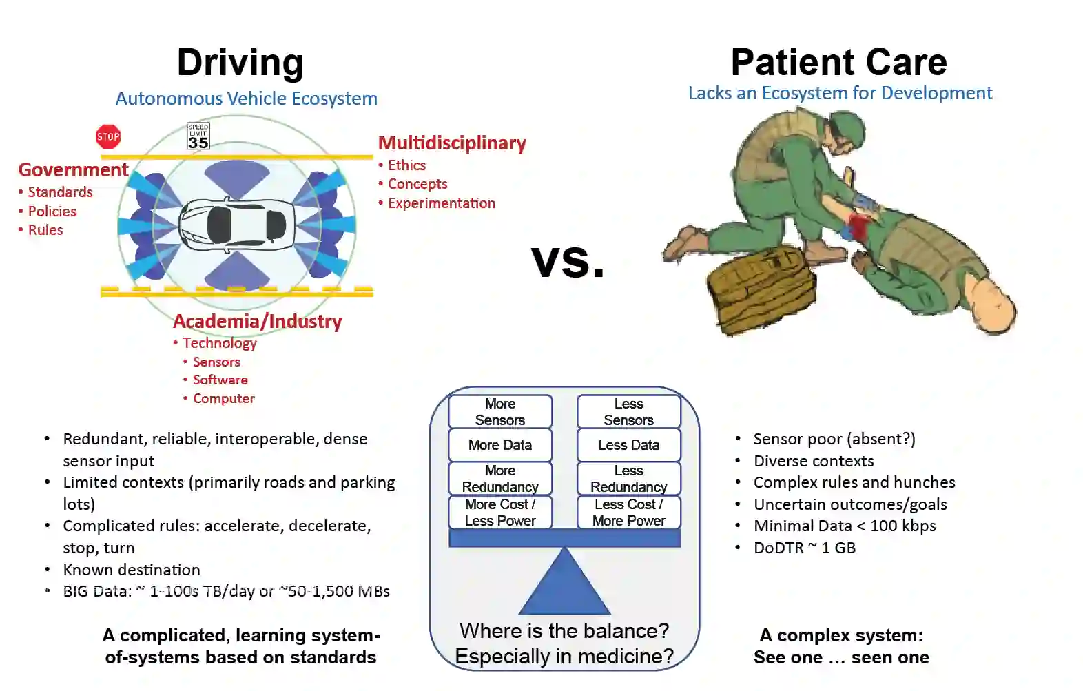 缺乏准确可靠的数据是构建可信人工智能的主要挑战。目前,医疗服务系统内的数据来源包括电子健康记录、战术战斗伤员护理卡(DD Form 1380)和手写笔记磁带,所有这些都需要人类以牺牲执行其他伤员护理任务为代价来完成。在伊拉克和阿富汗的三万名伤员中,只有不到 20% 的人有任何形式的院前记录,因为当有选择时,任务饱和的护理人员会选择还击、提供伤员护理和执行其他任务,而不是记录(作者的亲身经历)。此外,即使完成了记录,也几乎都是在伤员救治之后完成的,因此会出现延误,而且往往不正确或有偏差。鉴于这些限制,整个国防部(DOD)联合创伤系统的创伤登记表在 2006 年至 2023 年期间收集的数据大小还不到一千兆字节(据作者个人了解)。相比之下,Waymo(谷歌自动驾驶汽车项目)等自动驾驶汽车每分钟从二十五个传感器收集三千兆字节的数据,即每天收集三十二兆字节的数据(图 3)。