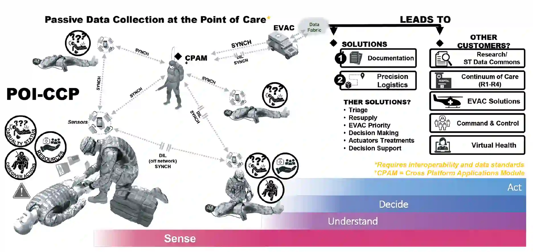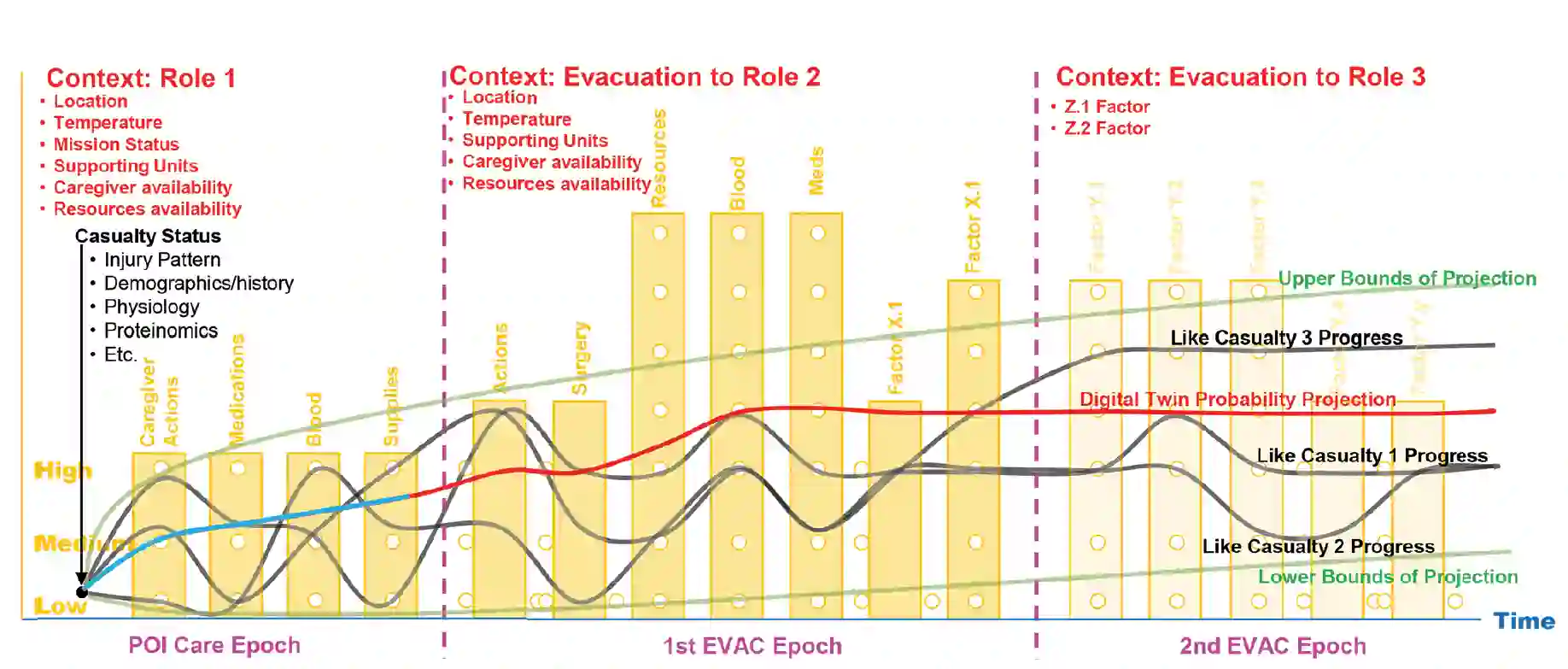 在大规模作战行动中,人类输入的文档将失效,因为人类将忙于为伤员提供救生护理。因此,依赖电子病历数据和预期的近期数字文档工具(如美国空军的战场辅助创伤分布式观察工具包(BATDOK))的系统将无法提供最佳护理、被动和持续学习所需的信息,也无法实时使用。相反,我们需要从传感器中被动收集到准确可靠的时间序列数据,这些数据涉及伤员状态、资源使用/消耗、护理人员及其行动,以及整个护理过程中的护理环境。这一基础数据集可为分流、后送、后勤补给、医疗指挥与控制以及医疗力量预测提供更精确的预测模型开发数据。