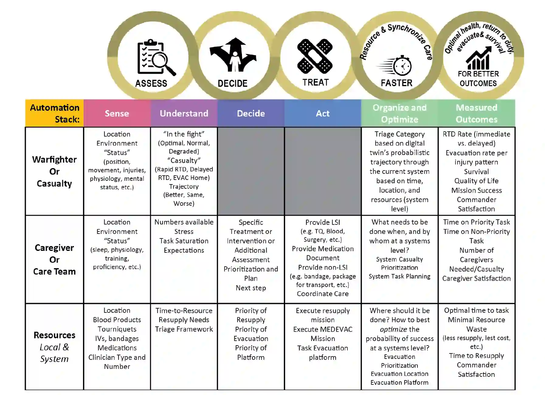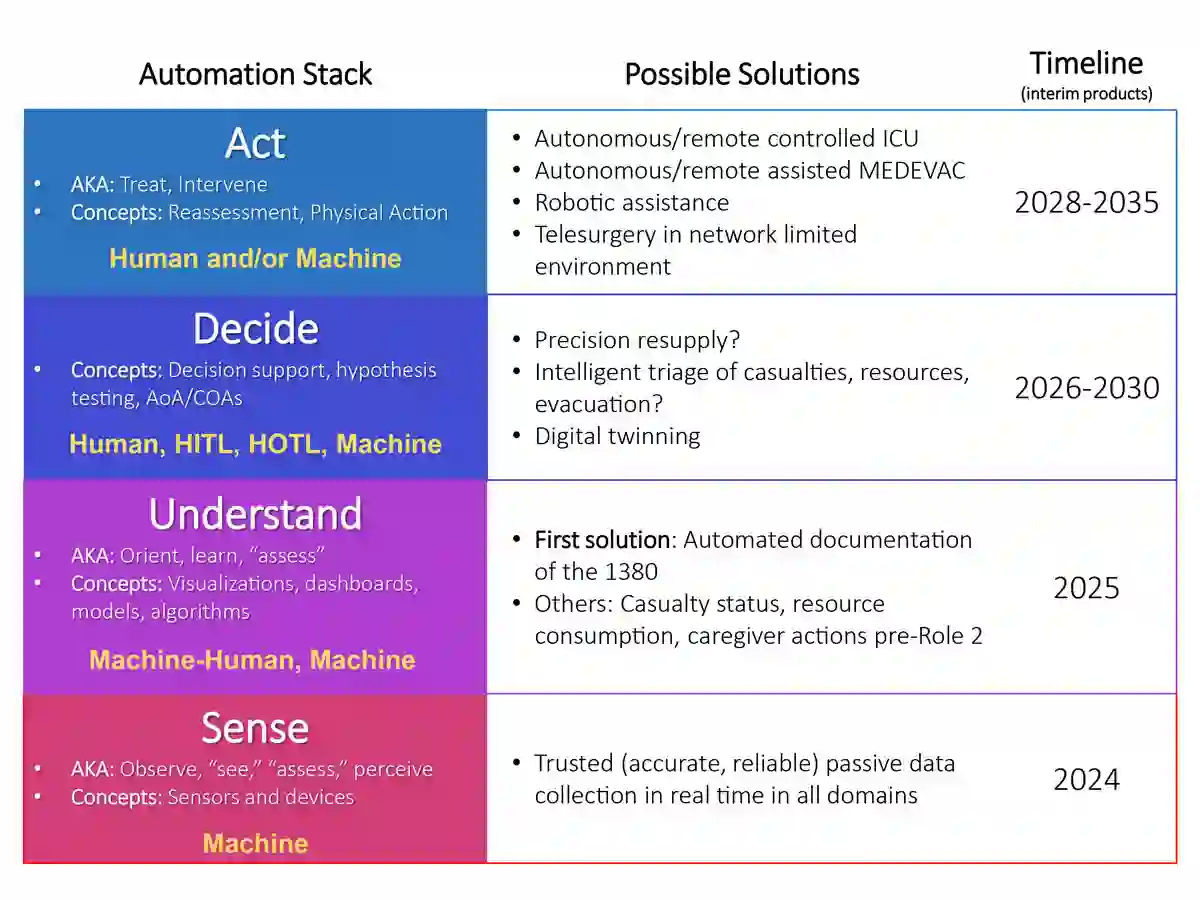 通过将数据、人力和技术融合到可优化系统性能的解决方案中,单靠人与技术的团队合作就能实现更快的流程。流程自动化可进一步提高性能和效率。生存链模型与自动化堆栈相似(比较图 1 和图 4)。它是了解如何在伤员救护中创建和加速人与技术团队合作的框架。与 “观察、定位、决定、行动 ”循环一样,自动化堆栈也是从使用传感器进行被动数据收集开始的。然后,我们可以利用这些传感器的数据来了解伤员护理的 5 个 W: