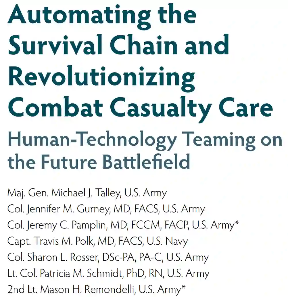 就像 “杀伤链 ”自动化概念能比敌人更快地执行致命武力一样,“生存链 ”也可以实现自动化,以加快有关伤员护理的关键决策,最大限度地保存战斗力(见图 1)。军事卫生系统在过去二十年的战争中取得了辉煌的伤亡战果,但现在却面临着与近邻对手进行大规模作战行动所带来的挑战。在这种情况下所面临的挑战是:伤亡频率高、伤亡人数多;在资源有限的环境中需要长期护理;训练有素的医疗服务人员数量不足;发生化学、生物、放射、核和定向能事件的可能性增大;非战斗伤病(如地方病、感染和矫形术)增加、 这就要求我们重新思考人工智能、机器人技术和人类技术团队如何能够加速生存链,并促进指挥官在未来战场上实现超配的前进动力。