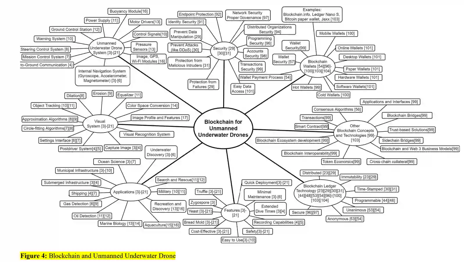 据观察,在将区块链与 UUDs 整合方面没有做出努力或做出的努力最少。图3展示了一个将UUDs的一些子系统与区块链概念相结合的例子。在这里,12个区块链节点展示了遥控无人机的不同子系统(照明、摄像头、白炽灯、交流/直流电源、传感器、高强度放电、荧光灯、电源、机械手和工具、LED、系绳和水下连接器)。每个节点都可以有一个或多个区块链来存储子系统事件和数据。这些数据将是不可变的、安全的、透明的,并分布在所有节点上。因此,各子系统在物理上、逻辑上并通过区块链连接起来。因此,它优化了车辆的性能和在各种应用中的使用。图 4 显示了独立研究的各种 UUD 和区块链概念。但是,要将这两种技术融合在一起,就必须对这些概念及其建议进行深入分析。