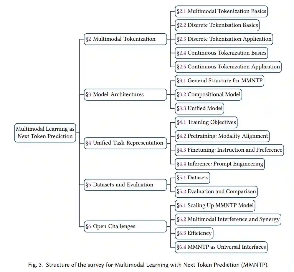 摘要:基于自然语言处理中的语言模型基础,下一个令牌预测(NTP)已经发展成为一个多功能的训练目标,广泛应用于各类模态的机器学习任务,并取得了显著的成功。随着大型语言模型(LLMs)发展到能够统一文本模态中的理解和生成任务,近期研究表明,来自不同模态的任务也可以有效地在NTP框架内进行 encapsulate(封装),将多模态信息转化为令牌,并根据上下文预测下一个令牌。本文综述提出了一个全面的分类法,通过NTP的视角统一了多模态学习中的理解和生成任务。该分类法涵盖了五个关键方面:多模态令牌化、多模态NTP模型架构、统一任务表示、数据集与评估以及开放挑战。该新分类法旨在帮助研究人员探索多模态智能。相关的GitHub仓库收集了最新的论文和资源库,网址为:https://github.com/LMM101/Awesome-Multimodal-Next-Token-Prediction。