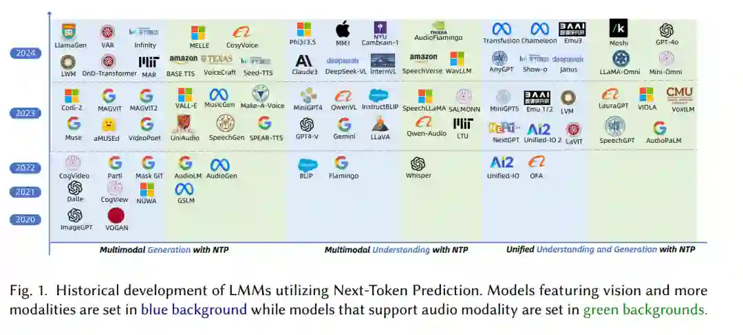 1.2 相关工作最近,几篇工作回顾了多模态学习中的大型多模态模型(LMMs)。例如,Yin等人[448]深入探讨了早期视觉语言模型的理解能力。类似地,Awais等人[8]、Bordes等人[27]、Ghosh等人[130]、Caffagni等人[36] 和 Zhang等人[477]进一步探索了多模态学习的最新进展,重点讨论了模型架构、训练策略、数据集、评估指标等内容。此外,还有几篇综述回顾了视觉语言任务中的多模态学习,包括预训练[36]、迁移学习[479]、推理[402]和基于人类反馈的强化学习(RLHF)[479]。除了讨论大型多模态模型的整体变革外,一些专业的综述还调查了LMMs在多模态代理[224, 421]和自动驾驶[72]等领域的应用。近期的综述也讨论了多模态学习中的关键问题,如LMMs中的幻觉[256, 334]和LMMs的效率[185, 429]。与先前主要关注多模态LLMs理解能力的研究不同,我们的综述采用系统化的视角,通过下一个令牌预测范式将理解与生成统一起来,进行多模态学习的整合性评估。据我们所知,这是第一篇从下一个令牌预测角度回顾LMMs的综述,旨在帮助研究人员探索多模态智能。总之,本综述旨在全面回顾当前依赖下一个令牌预测的多模态模型。相关的GitHub链接收录了最新的论文,网址为:https://github.com/LMM101/Awesome-Multimodal-Next-Token-Prediction。