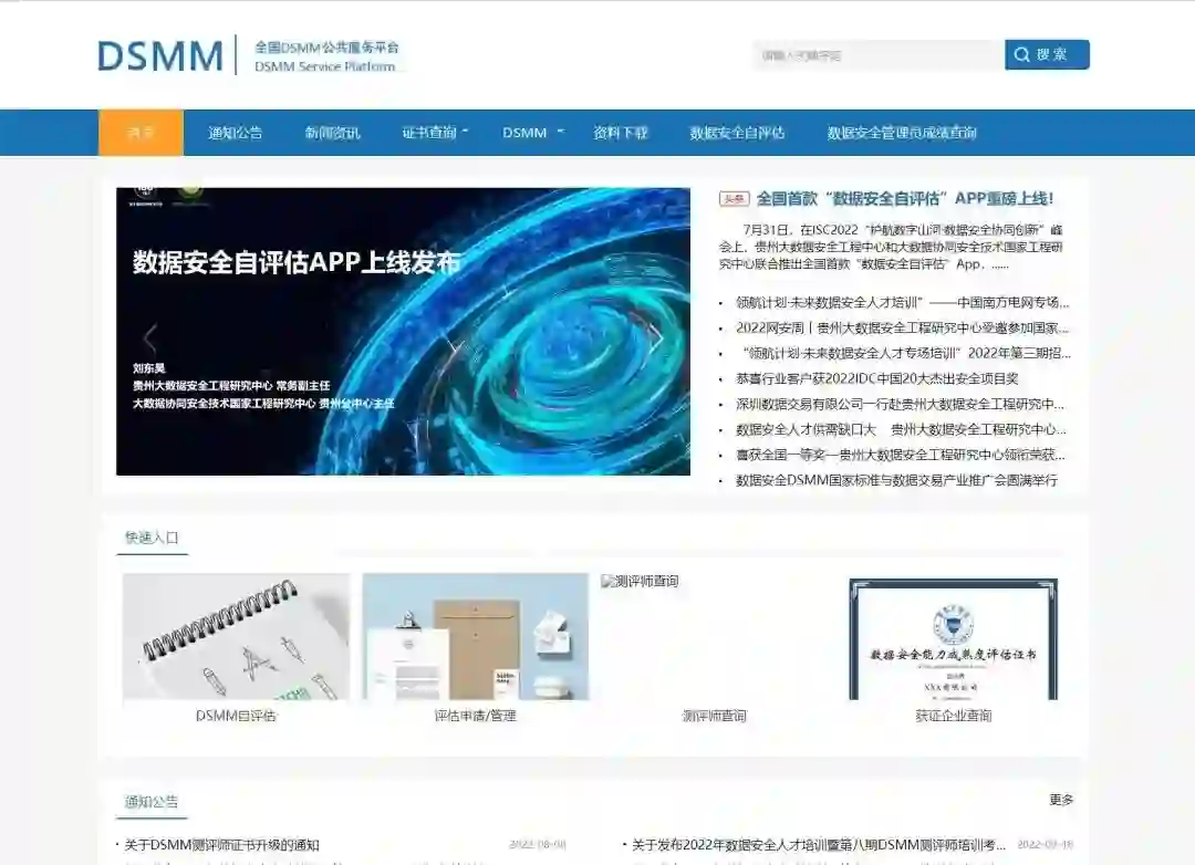 全国DSMM公共服务平台(dsmm.org.cn)汇集行业最新动态、知识成果,服务于行业数据安全能力的提升。该平台按照DSMM评估标准流程实现了DSMM评估管理的电子化,包括企业信息管理、评估项目管理、证书管理等功能模块。通过该平台,一方面企业可通过评估项目管理模块提交评估申请流程,经审核通过之后可查询当前评估所处的环节;另一方面企业可通过企业信息管理模块查询企业信息,同时在通过评估之后可进行企业证书的查询。
